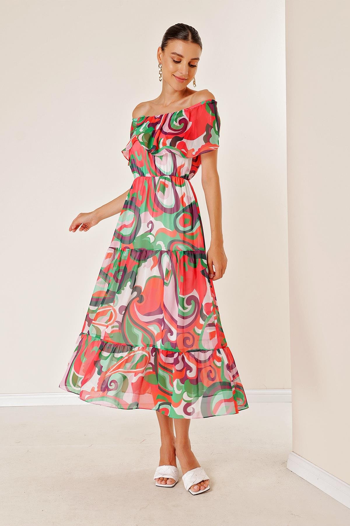 Madonna Yaka Şal Desenli Astarlı Şifon Elbise (S-23K0840023)