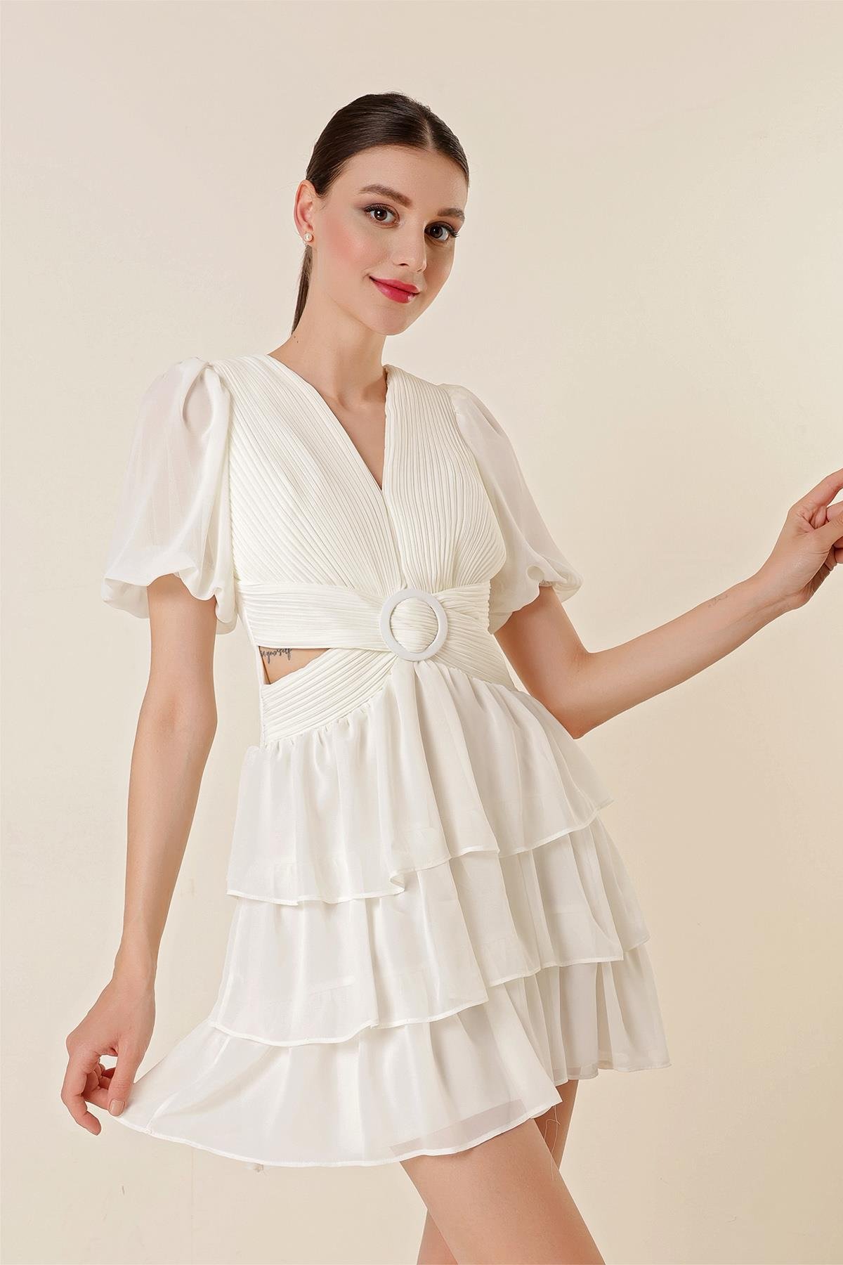 S-22K0190012Bel Dekolteli Arkası Çapraz İpli Kat Kat Şifon Elbise