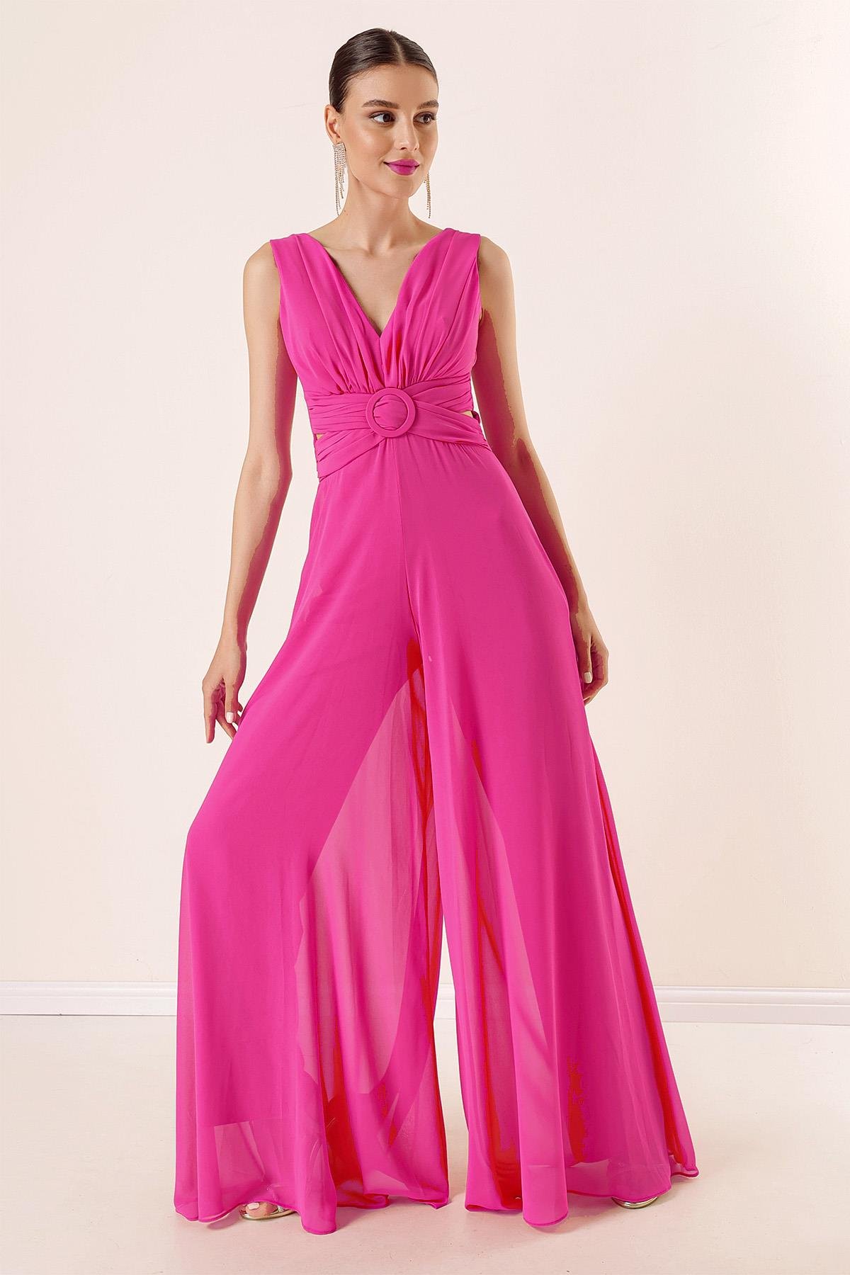 S-22K1230002Bel Dekolteli Ön Arka V Yaka Astarlı Şifon Tulum