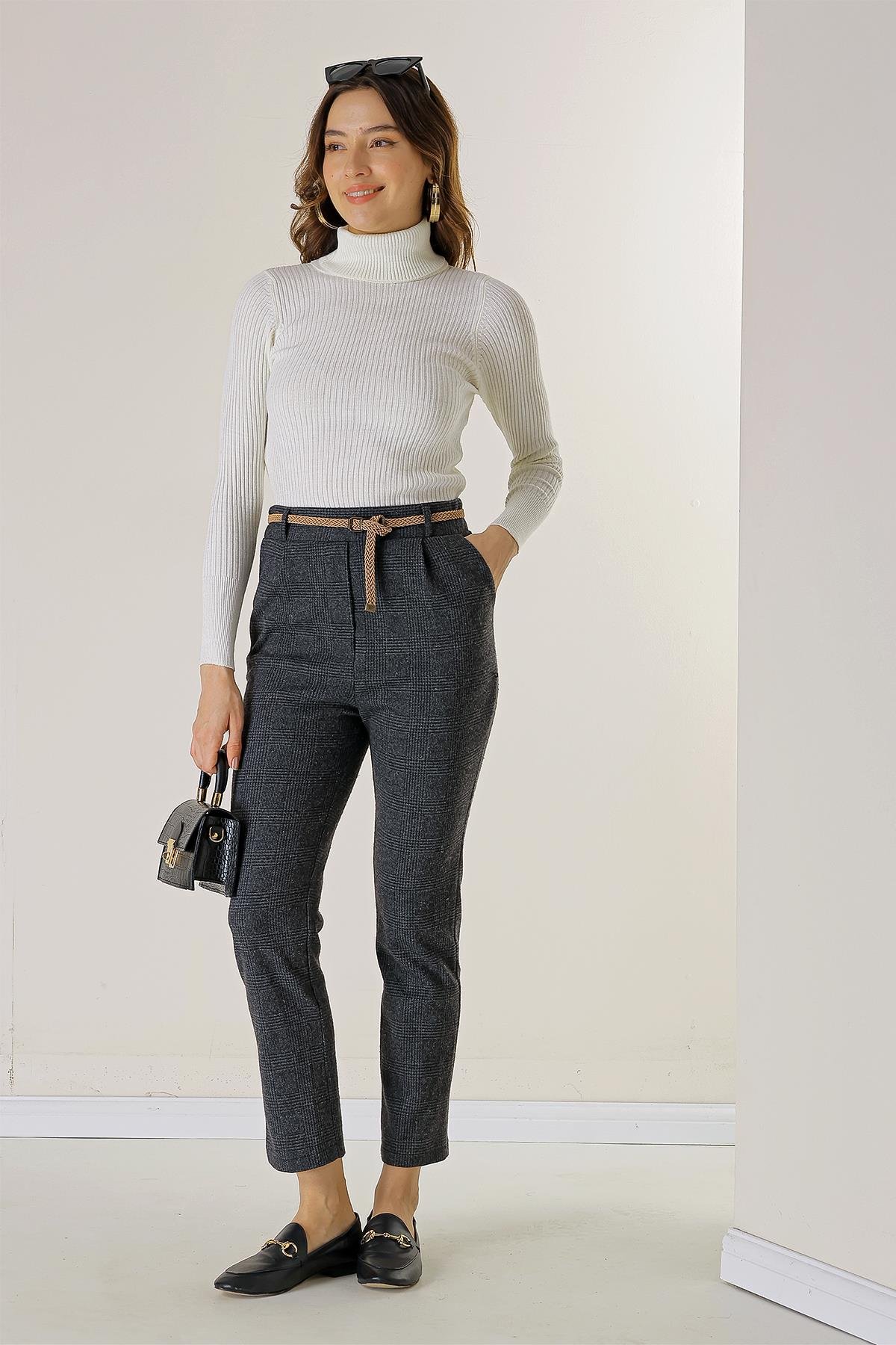 S-23K4140051Bel Lastikli Kemerli Yandan Cepli Ekose Dar Paça Pantolon