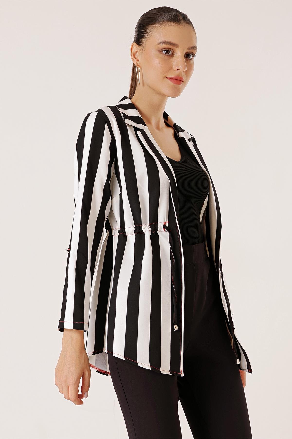 Beli İpli Kol Katlamalı Boyuna Kalın Çizgili Kırmızı İp Detaylı Ceket (S-23K3310021)