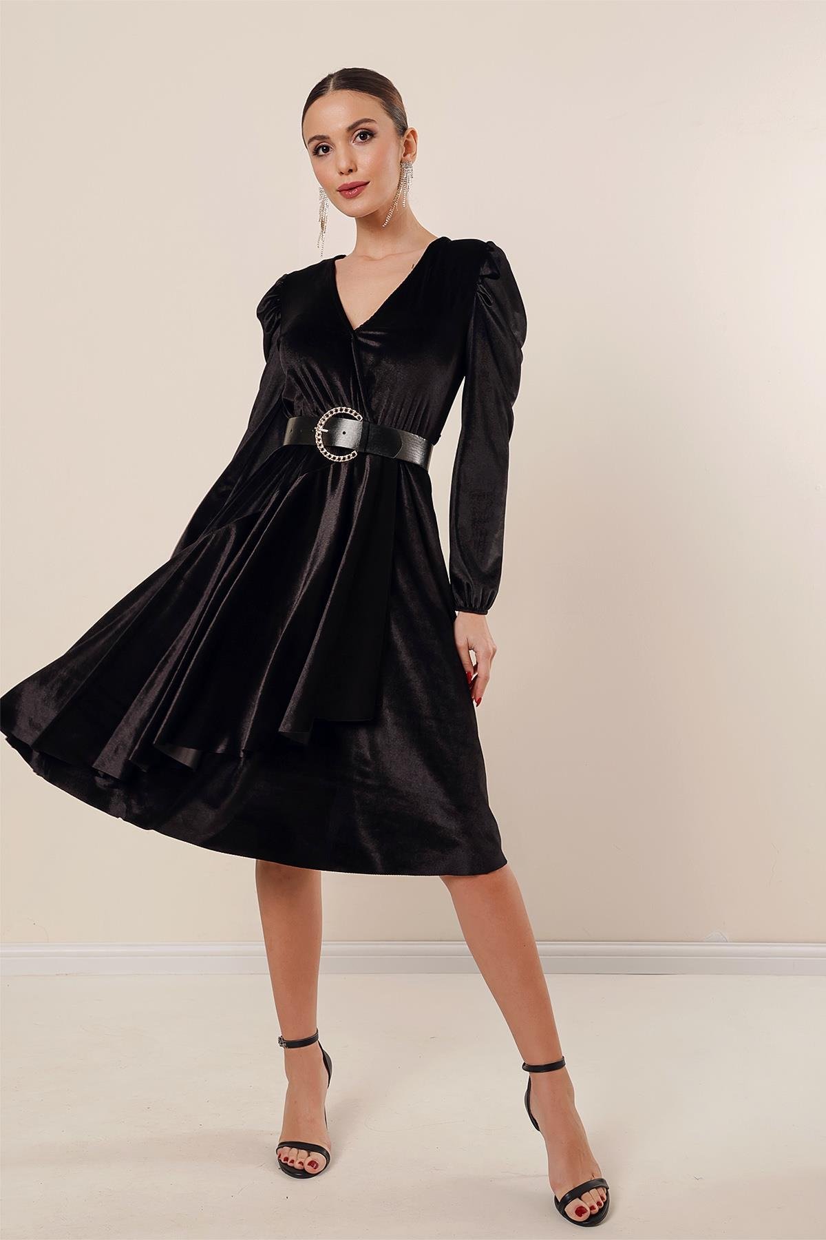 S-23K3500012Beli Kemerli Çift Volanlı Kadife Elbise