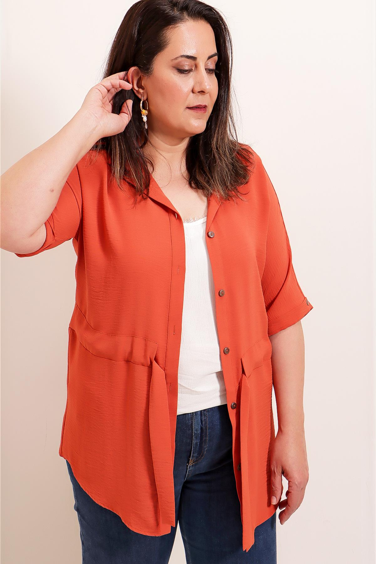 Beli Kuşaklı Önü Düğmeli Büyük Beden Ayrobin Tunik Gömlek (S-22K0990025)