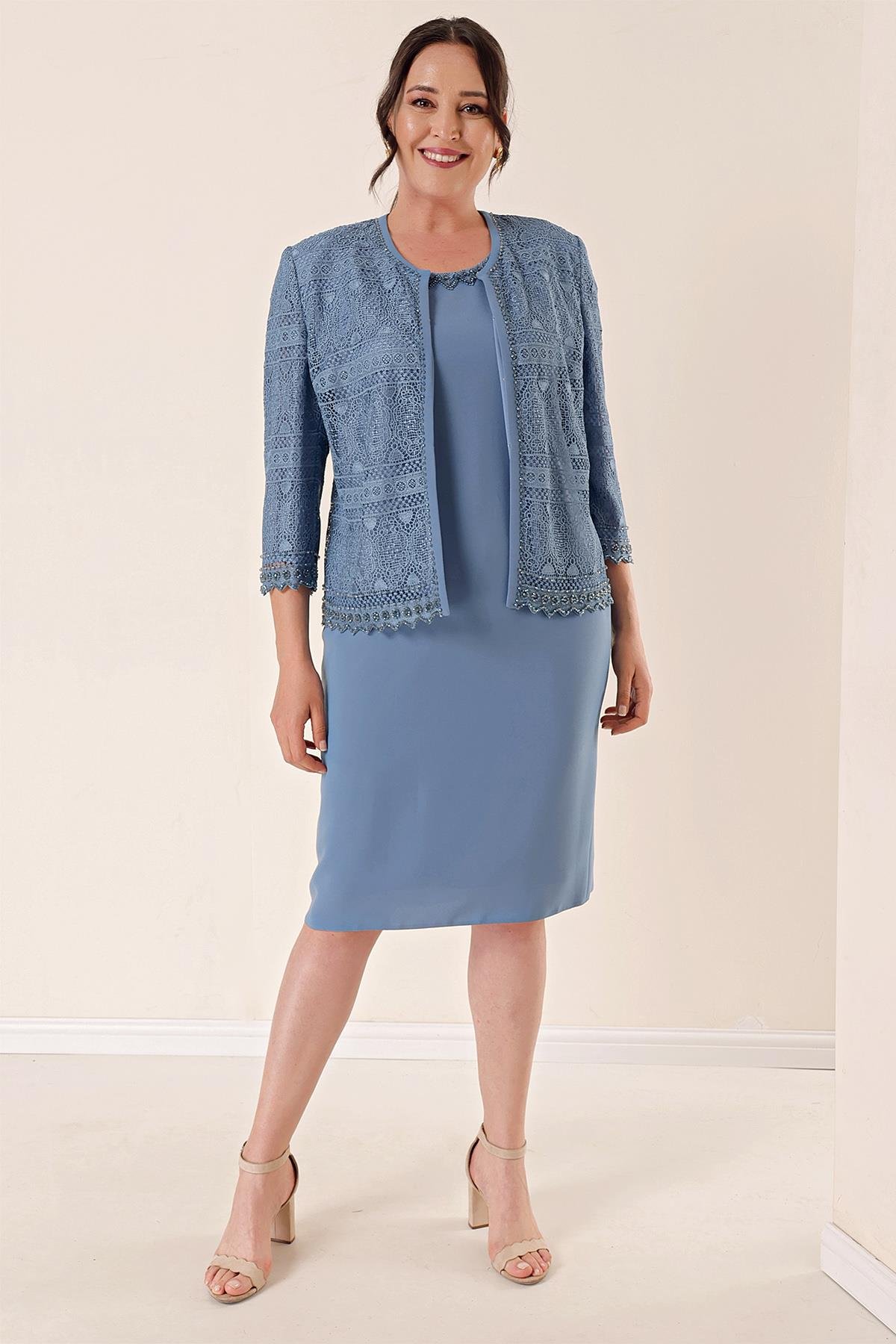 Boncuk Detaylı Güpür Ceket Astarlı Krep Elbise Büyük Beden İkili Takım (S-22K3070001)