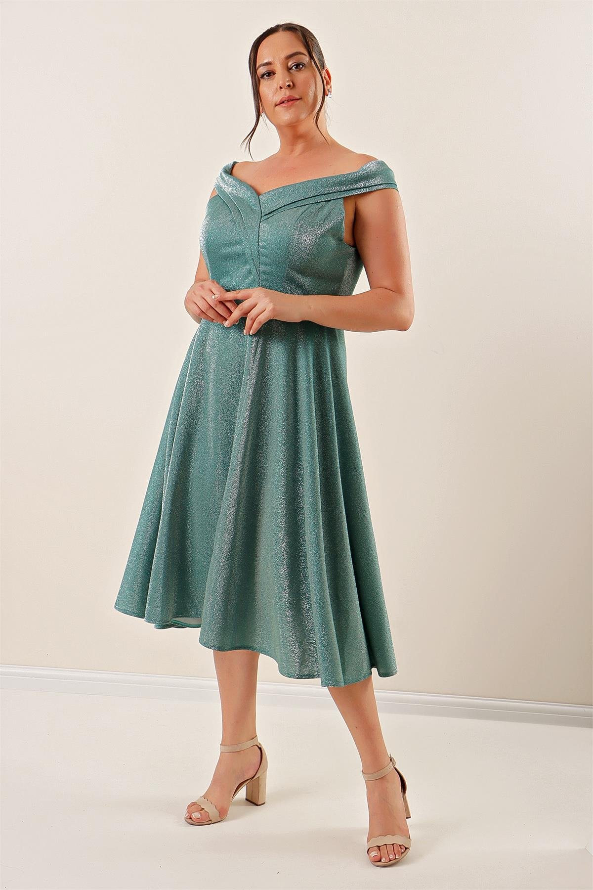 Çift Madonna Yaka Önü Yırtmaçlı Astarlı Simli Büyük Beden Elbise (S-22K1040027)