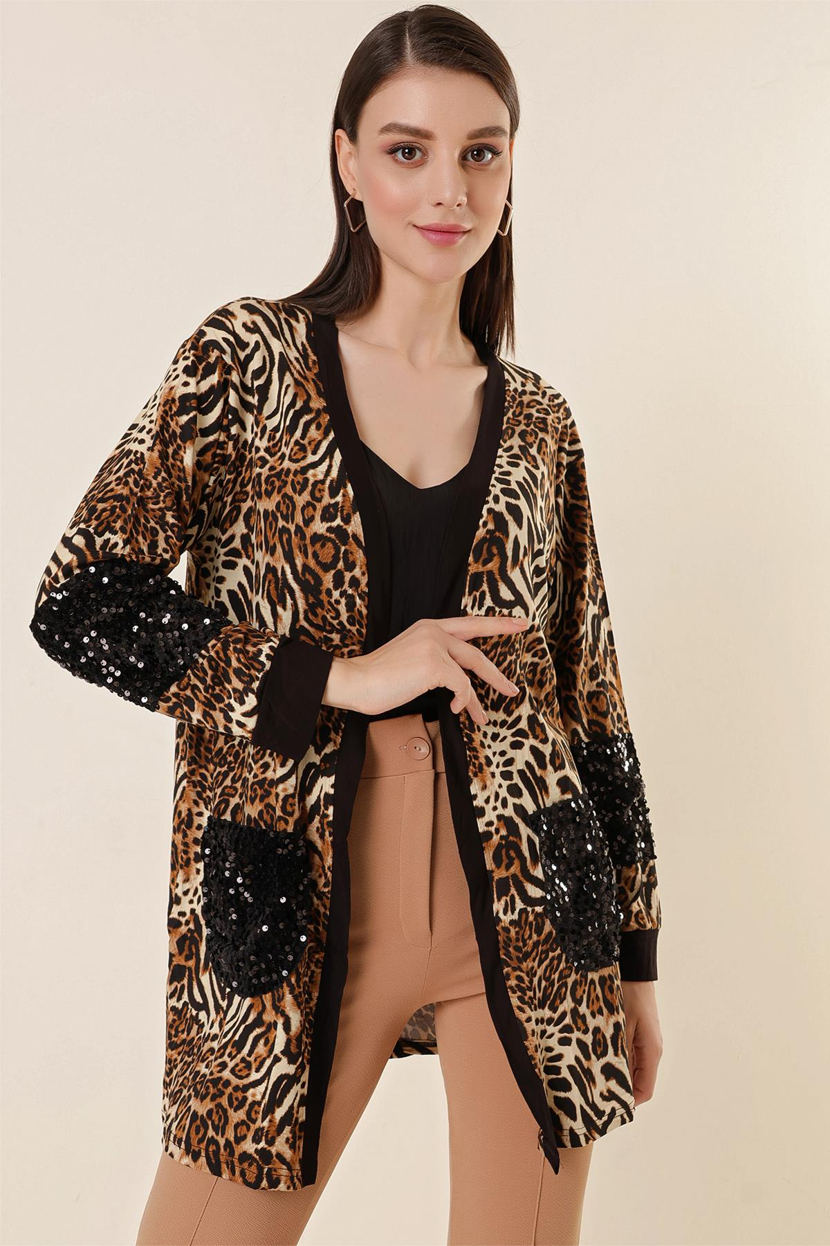 S-23K3160008Detaylı Cepli Leopar Desenli Likralı Hırka