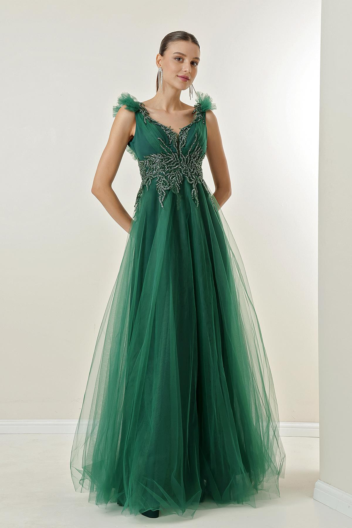 Bead-Embellished Long Tulle Dress with tie-back and lining (S-23K0490036)
