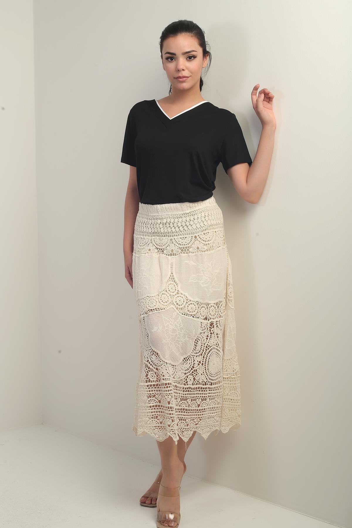 S-25Y1690006Kadın Beli Lastikli Astarlı Dantel Fisto Midi Etek