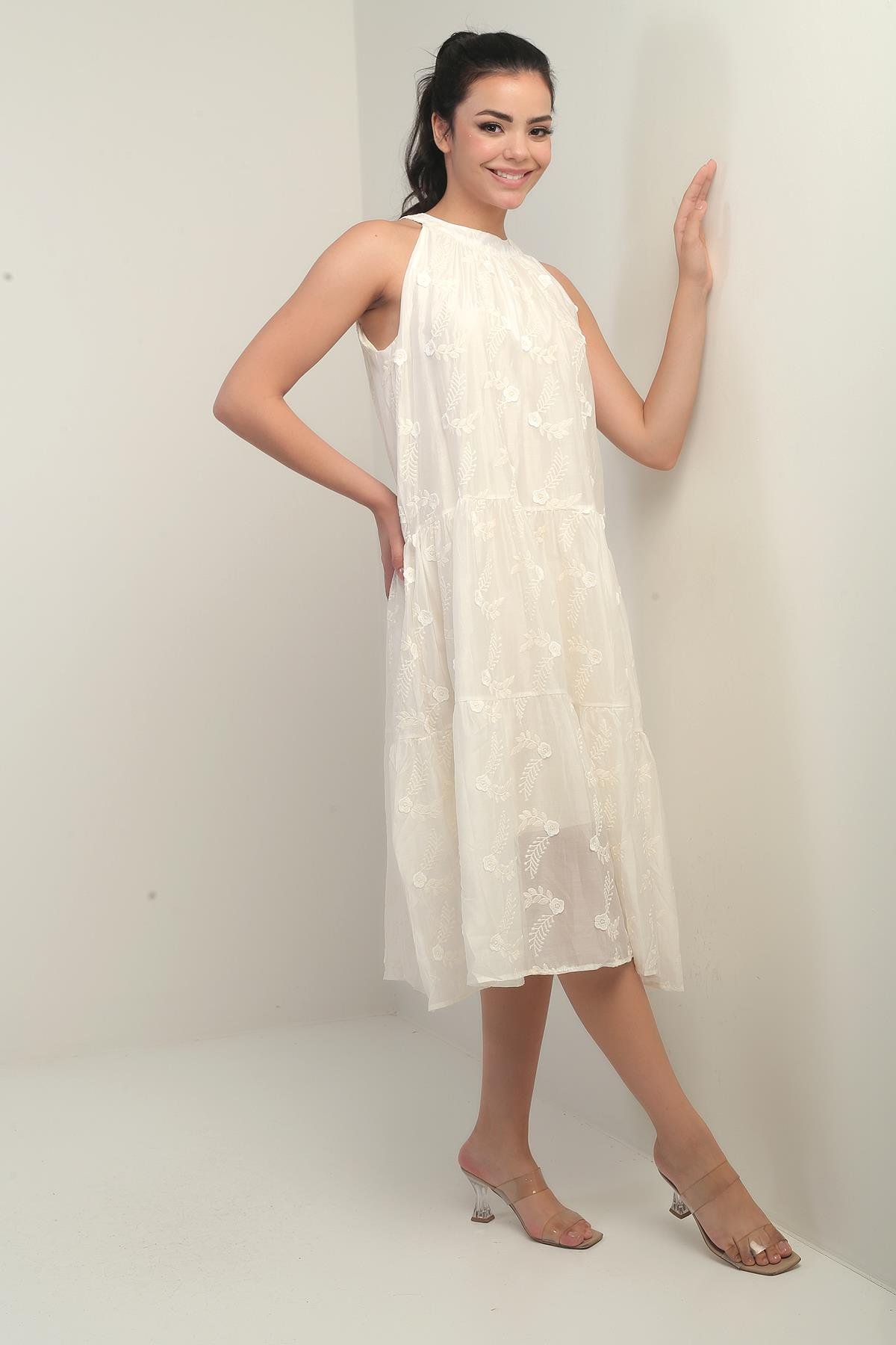 Kadın Halter Yaka Bağcıklı Astarlı Nakışlı Midi Elbise (S-25Y1690011)