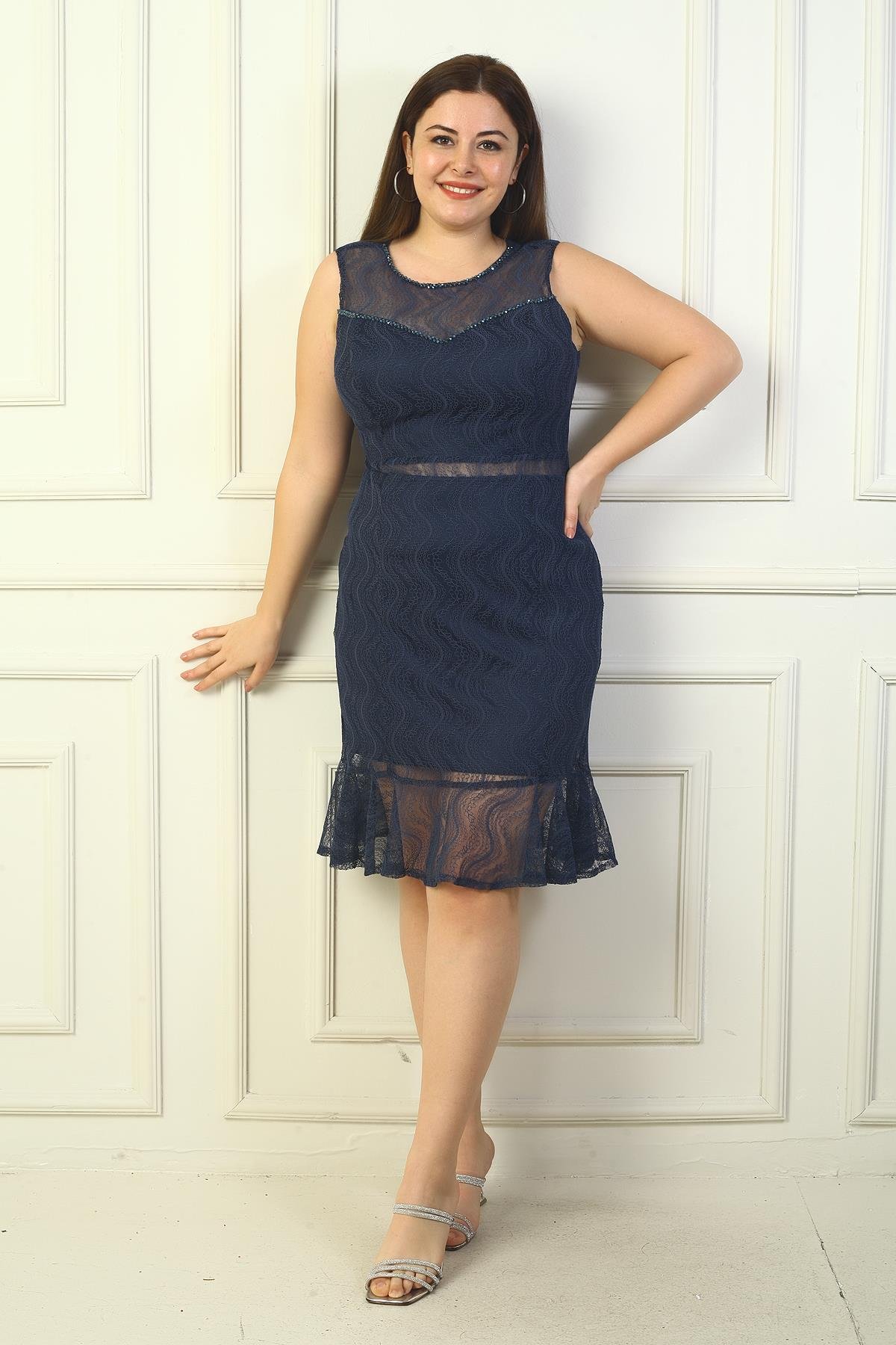 Kadın Önü Boncuk İşlemeli Eteği Volanlı Astarlı Büyük Beden Dantel Elbise (S-24Y3050025)