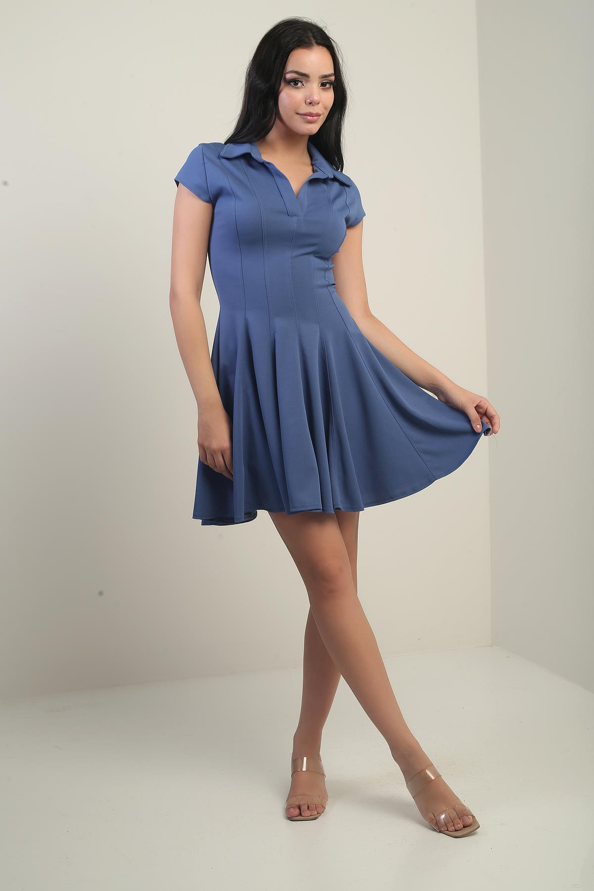 S-25Y0840025Kadın Polo Yaka Ay Kollu Likralı Kloş Kısa Elbise