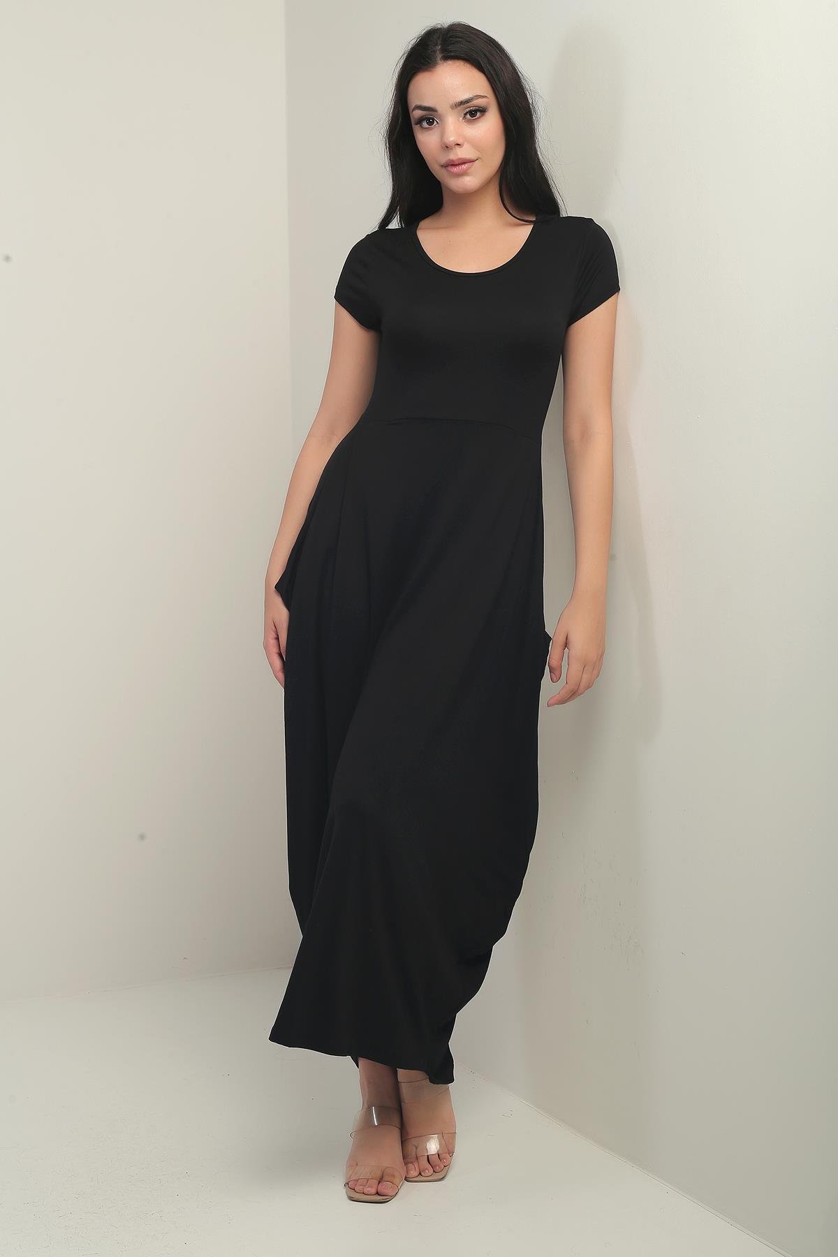 S-25Y0270020Kadın Yuvarlak Yaka Cepli Likralı Şalvar Elbise