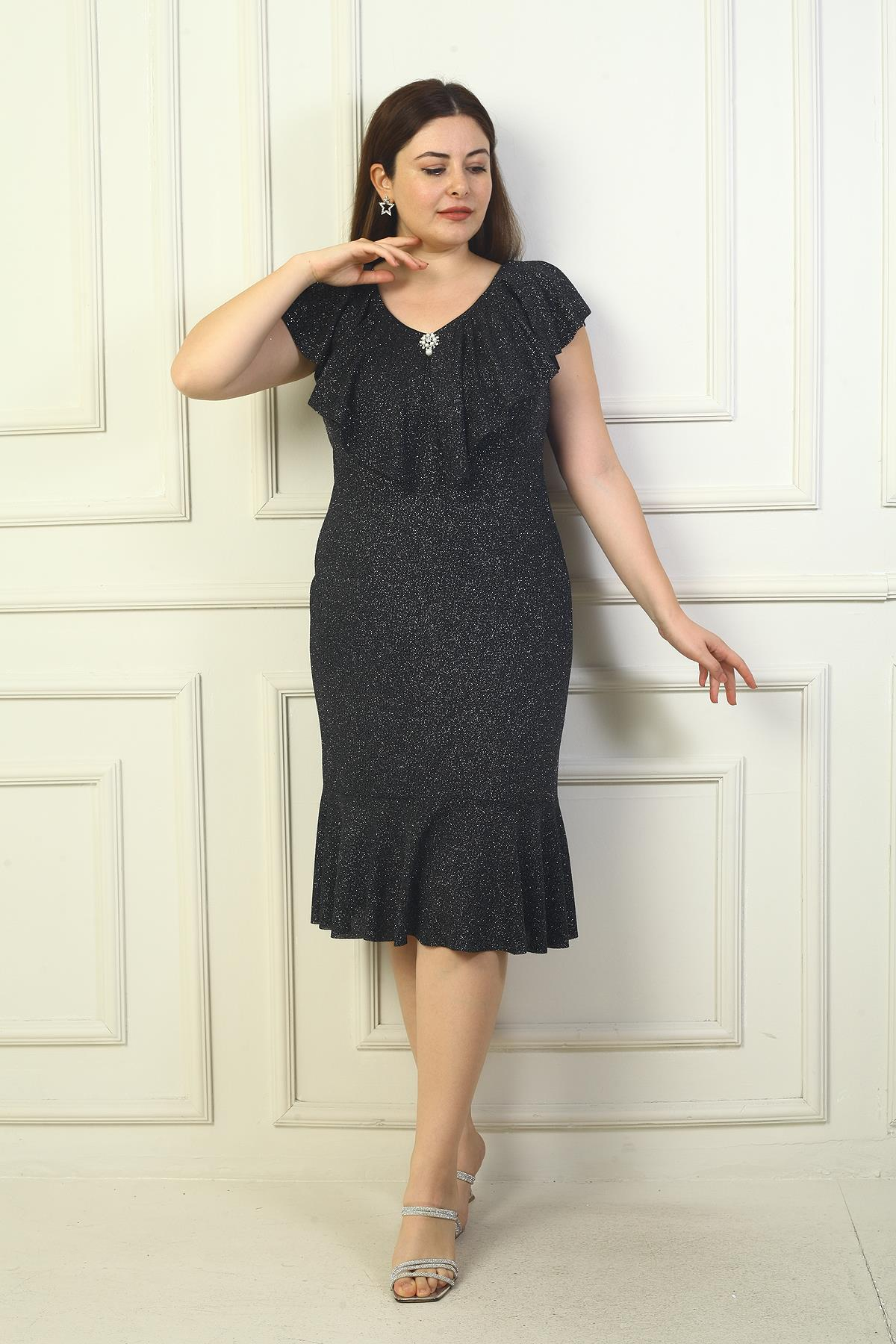 Volanlı Yaka Broşlu Simli Büyük Beden Elbise (S-20Y0910009)