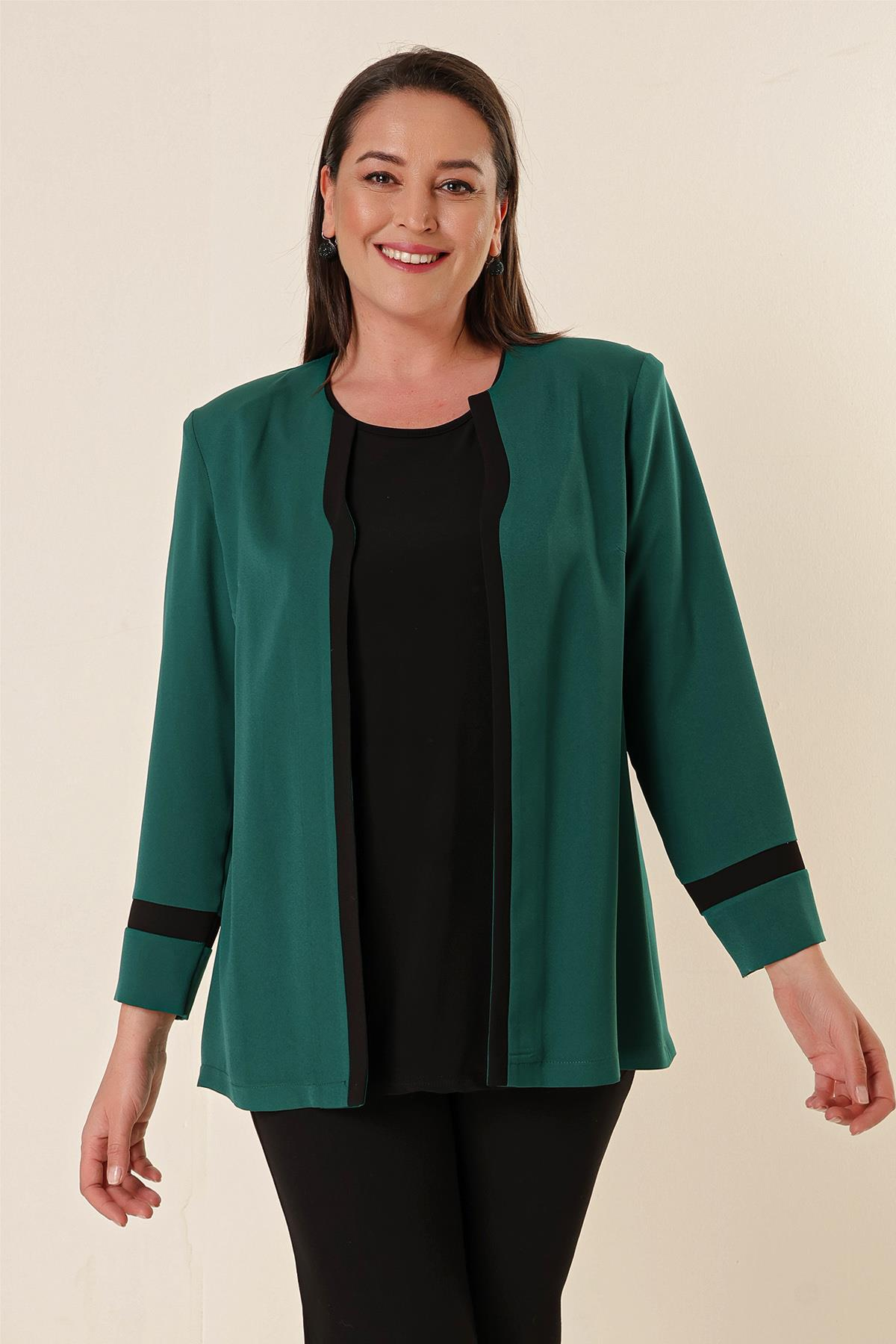 S-23K0520008İçi Likralı Atlet Omuzlar Vatkalı Garnili Büyük Beden Krep Ceket 2'li Takım