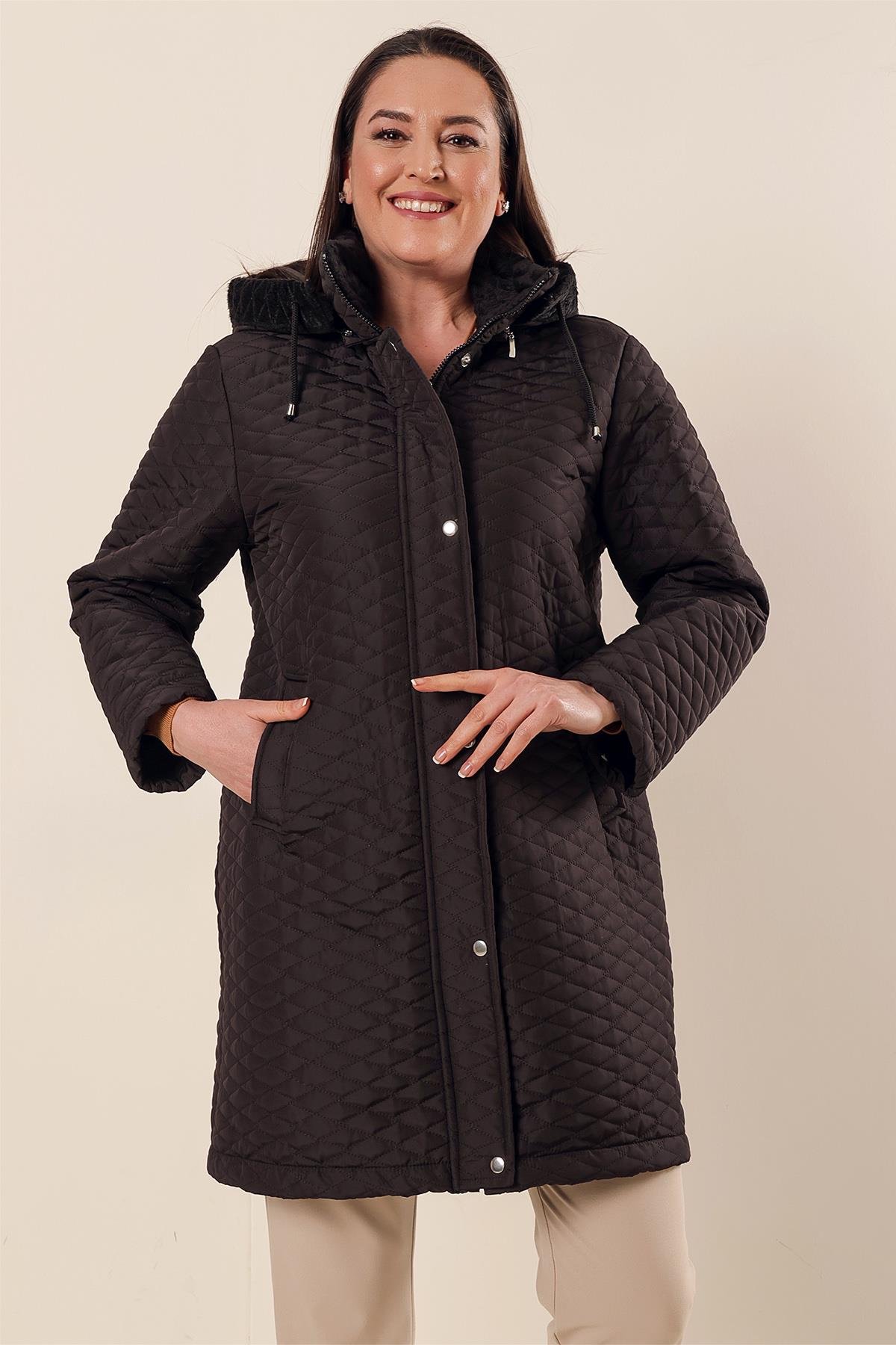 S-23K1040011İçi Ve Kapüşonu Peluş Cepli Büyük Beden Kapitone Kaban