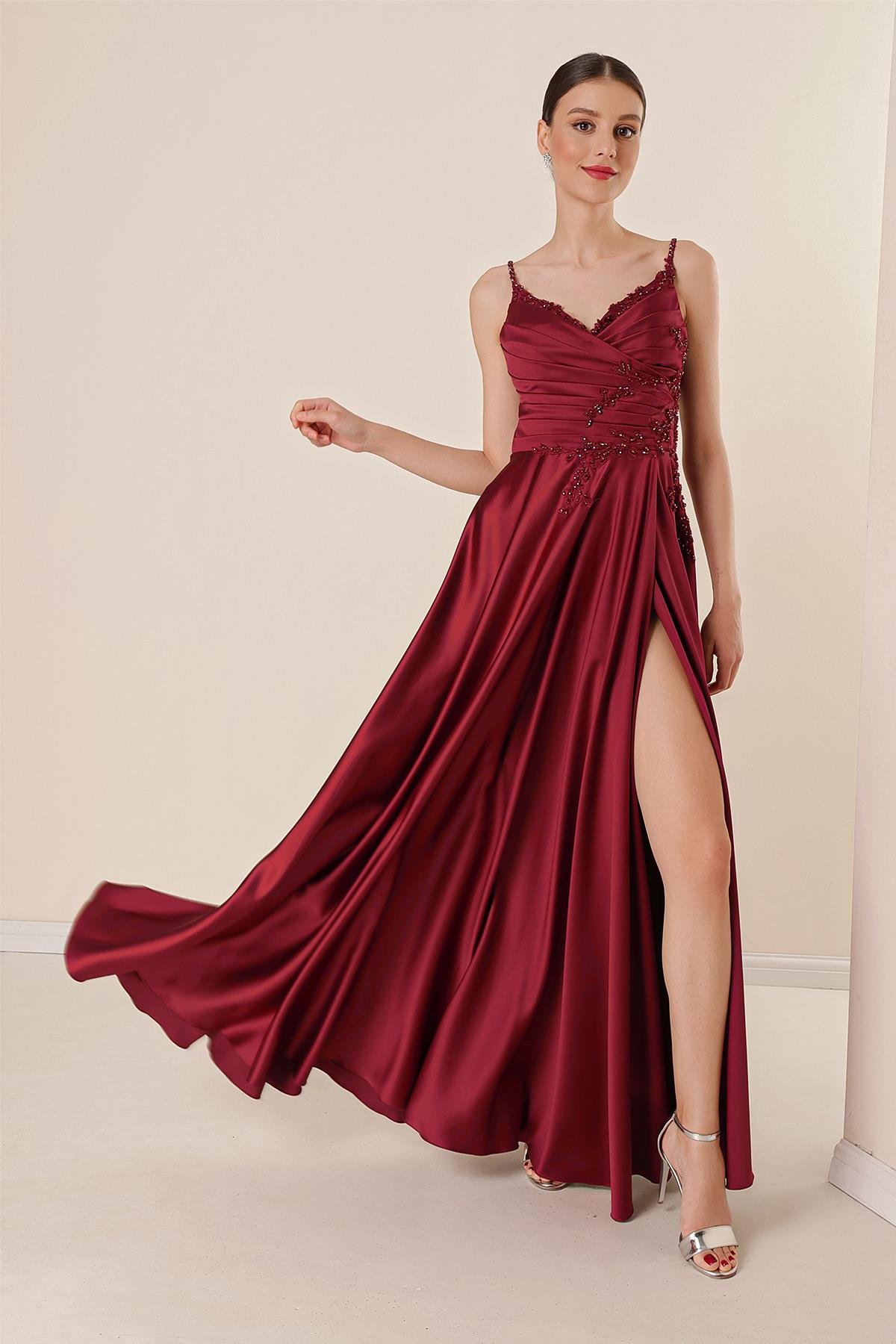 İp Askılı Boncuk Güpür Detaylı Astarlı Drapeli Uzun Saten Elbise (S-23K4120004)