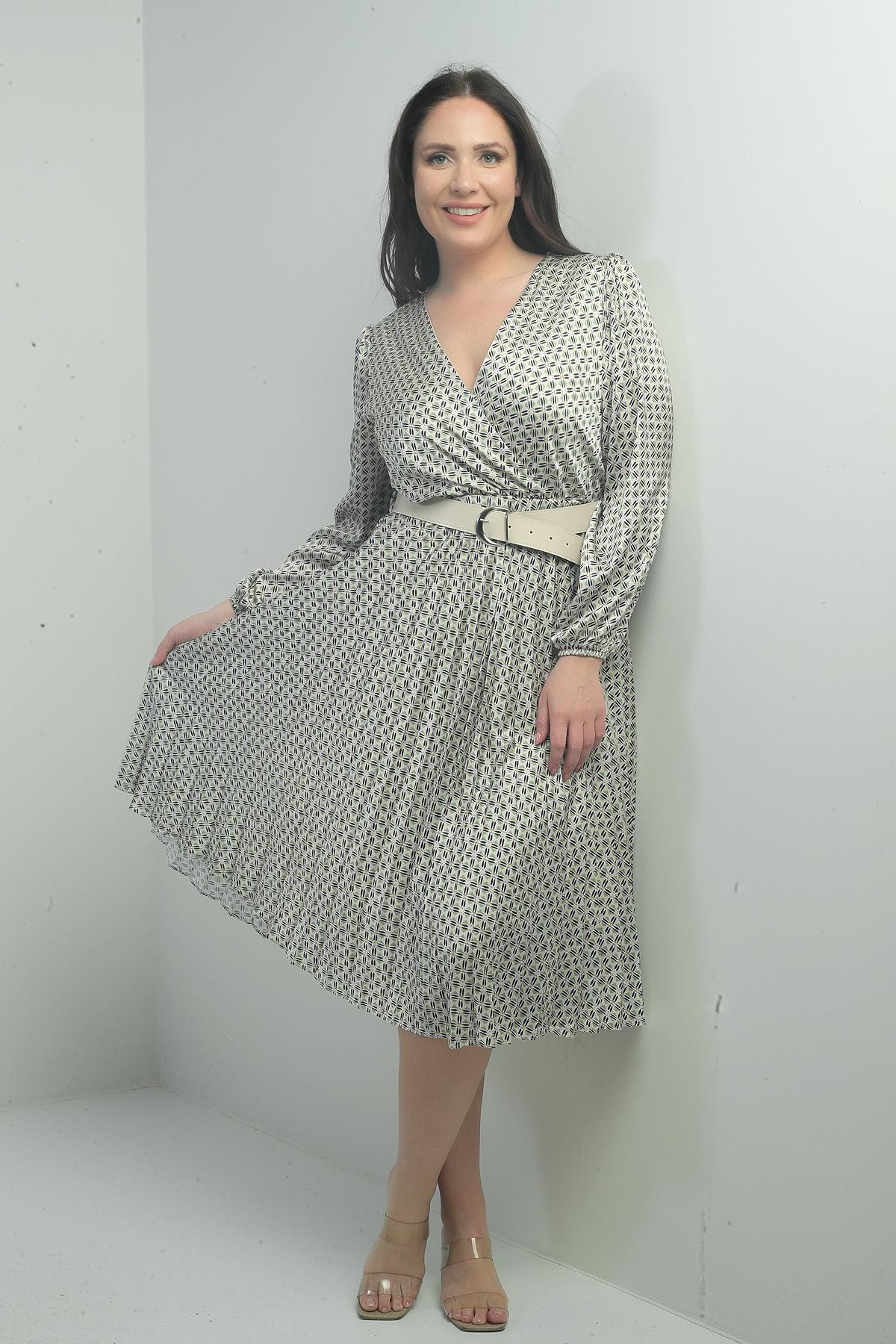 Kadın Kruvaze Yaka Beli Kemerli Astarlı Desenli Pileli Midi Saten B.B Elbise (S-25K1520004)