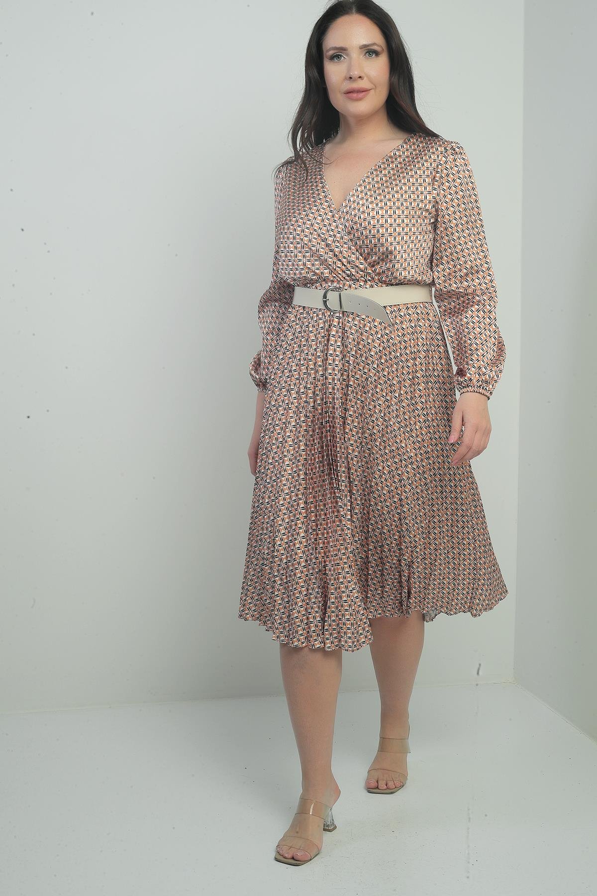 Kadın Kruvaze Yaka Beli Kemerli Astarlı Desenli Pileli Midi Saten B.B Elbise (S-25K1520004)