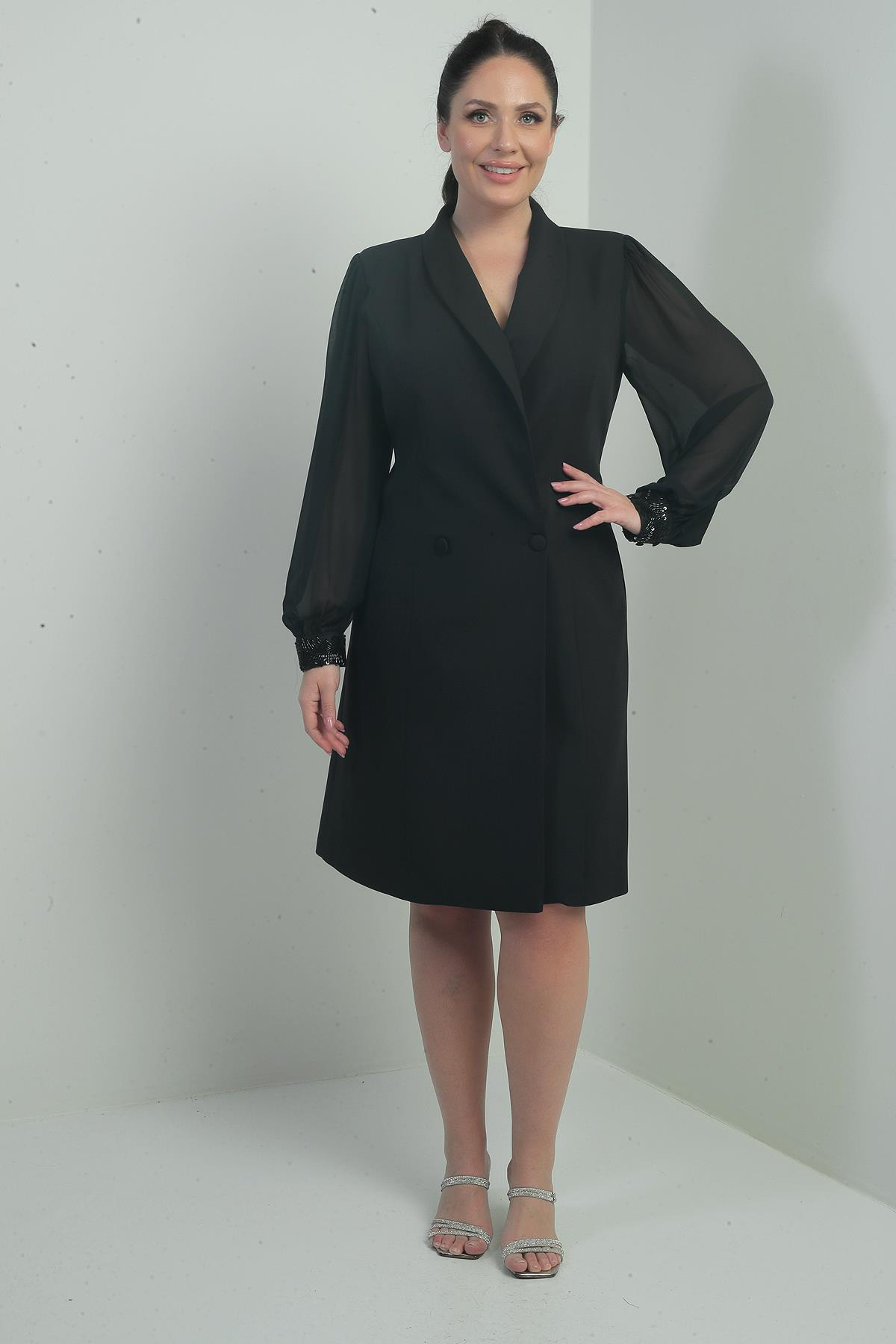 S-25K2580003Kadın Kruvaze Yaka Kolları Şifon Boncuk Detaylı Astarlı Büyük Beden Elbise