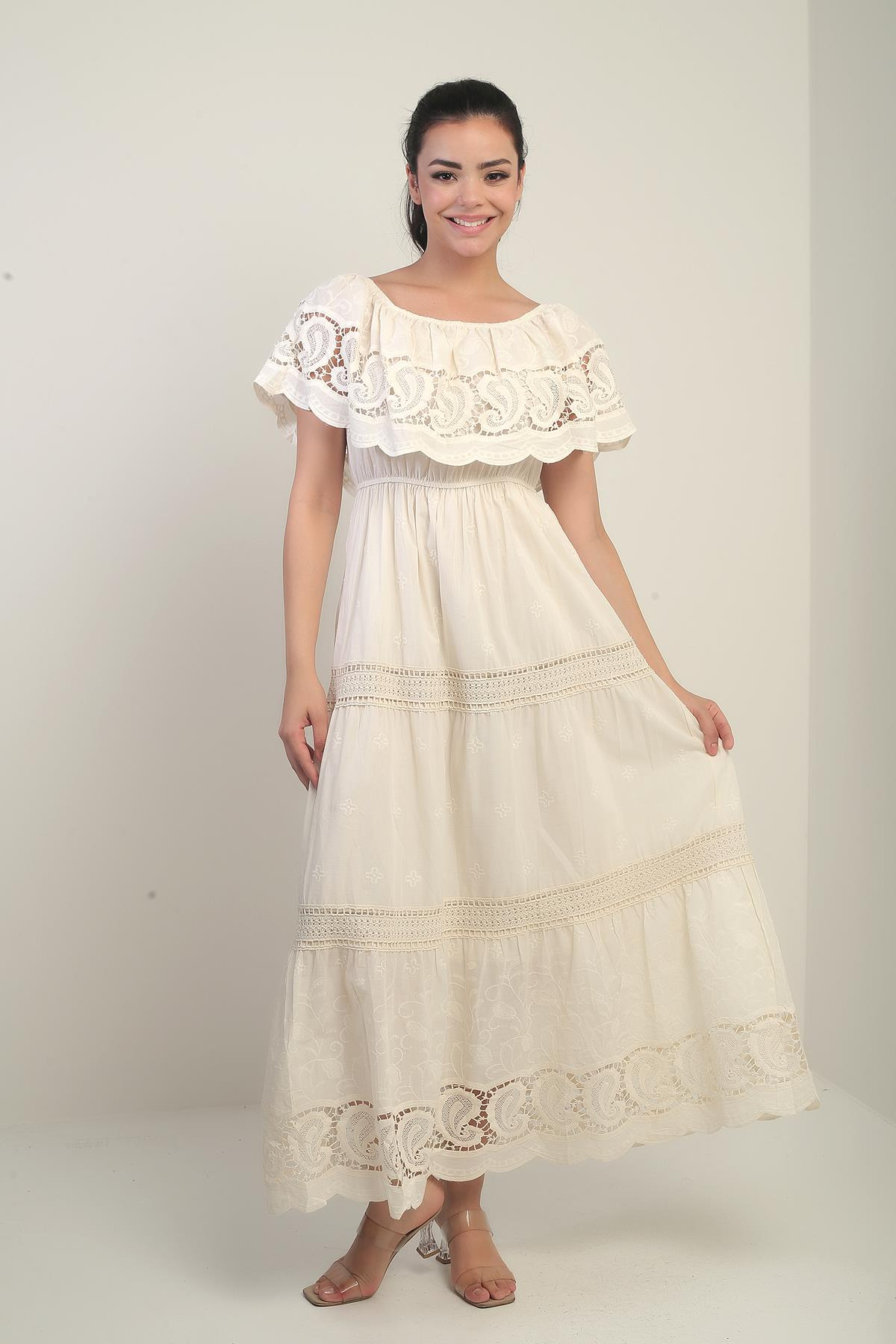 Kadın Madonna Yaka Astarlı Dantel Detaylı Nakışlı Uzun Elbise (S-25Y1690014)