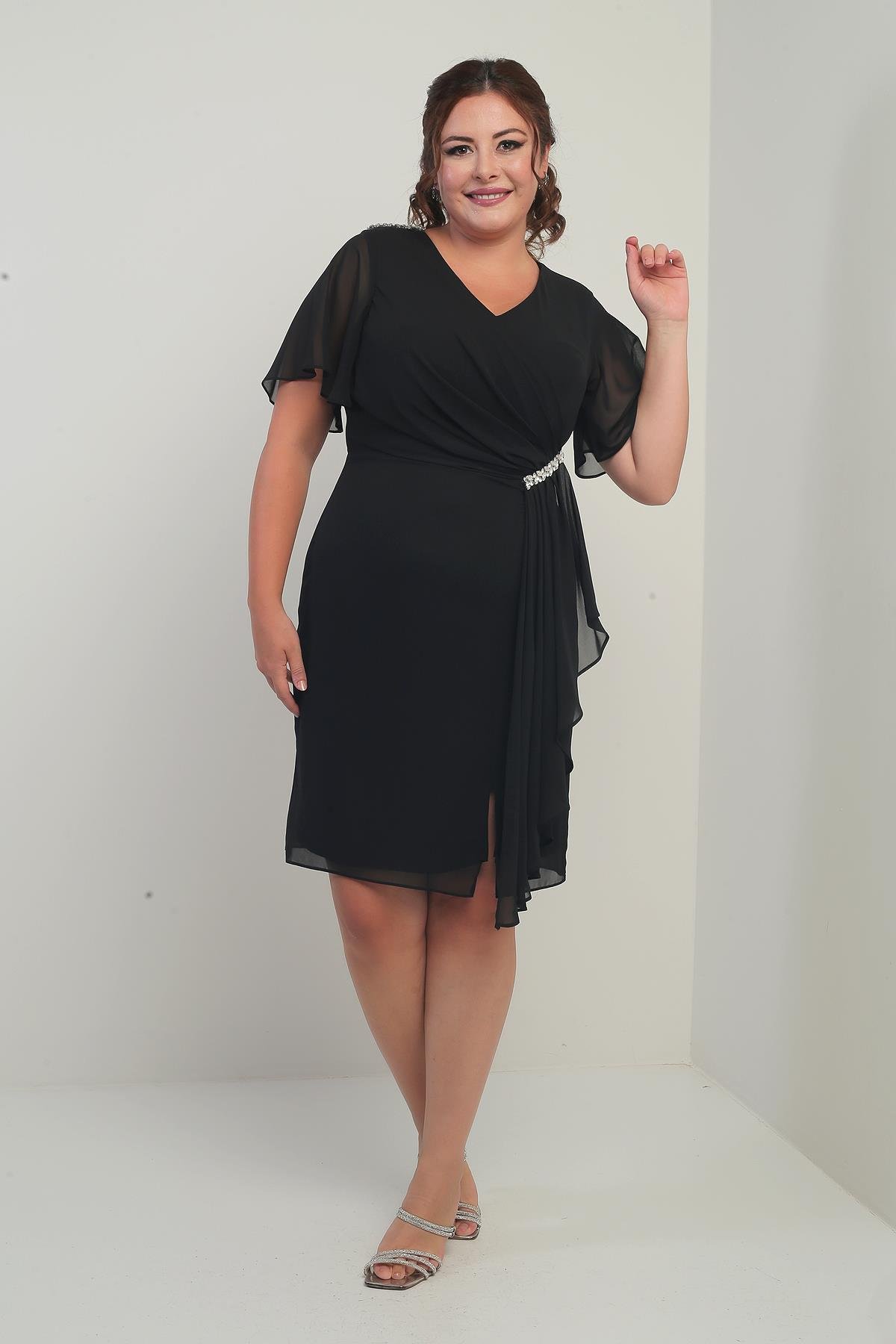 S-25Y3630003Kadın Omuz Ve Bel Kristal Taşlı Astarlı Mendilli Büyük Beden Şifon Elbise
