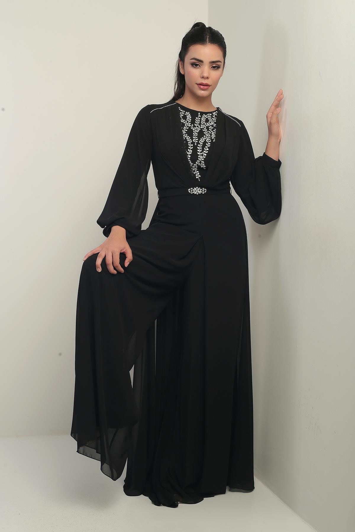 S-25Y1190006Kadın Ön Arka Taş Detaylı Astarlı Bol Paça Şifon Tulum