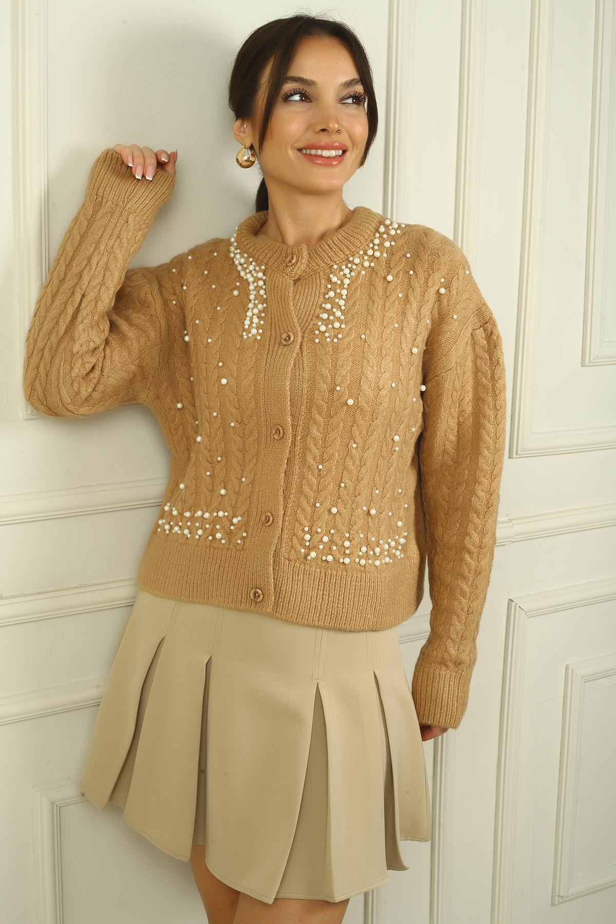 S-24Y4280006Kadın Önü Düğmeli İncili Saç Örgülü Akrilik Hırka