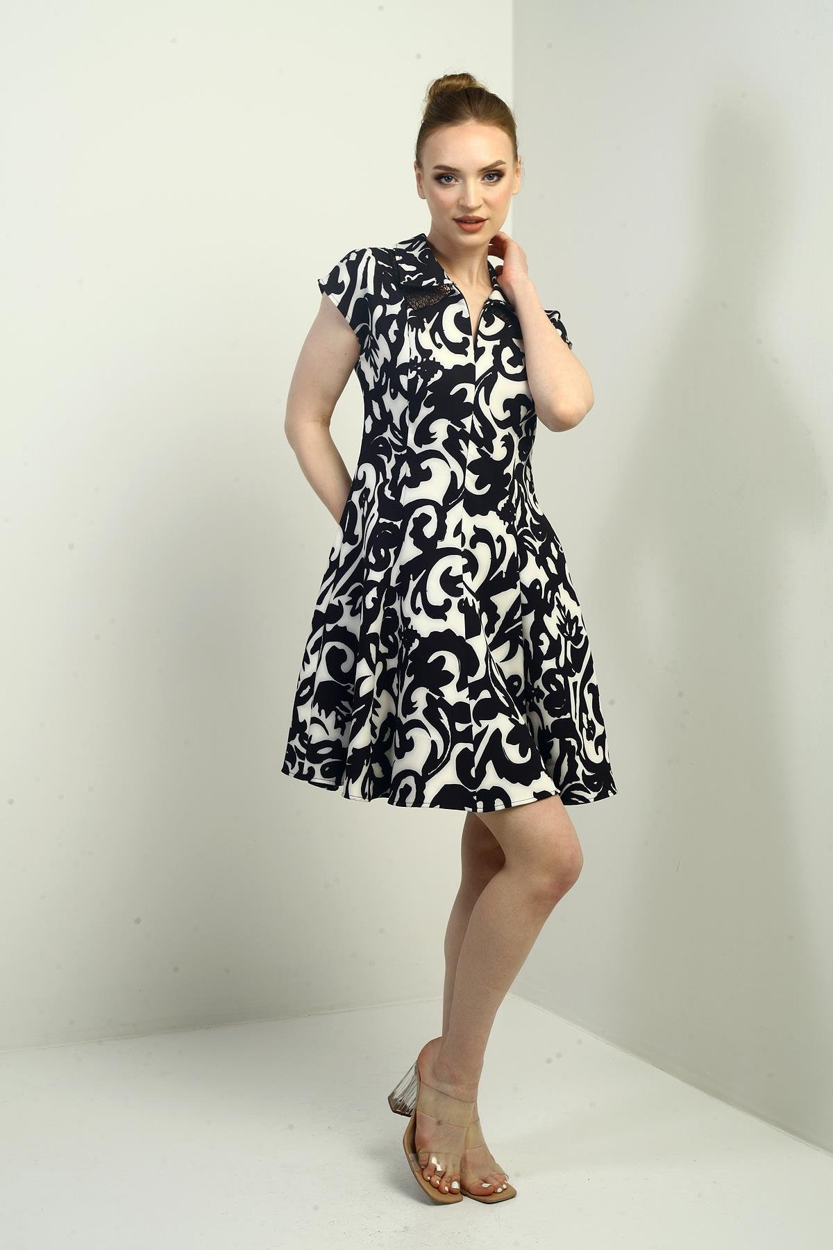 S-25Y0840023Kadın Önü Yarım Fermuar Ve Dantel Detaylı Kendinden Telalı Etnik Desen Kısa Kloş Elbise