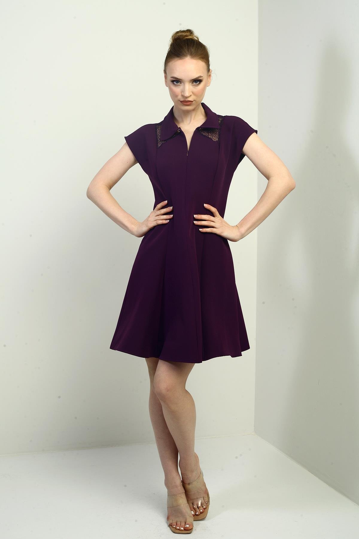 S-25Y0840022Kadın Önü Yarım Fermuar Ve Dantel Detaylı Kendinden Telalı Kısa Kloş Elbise