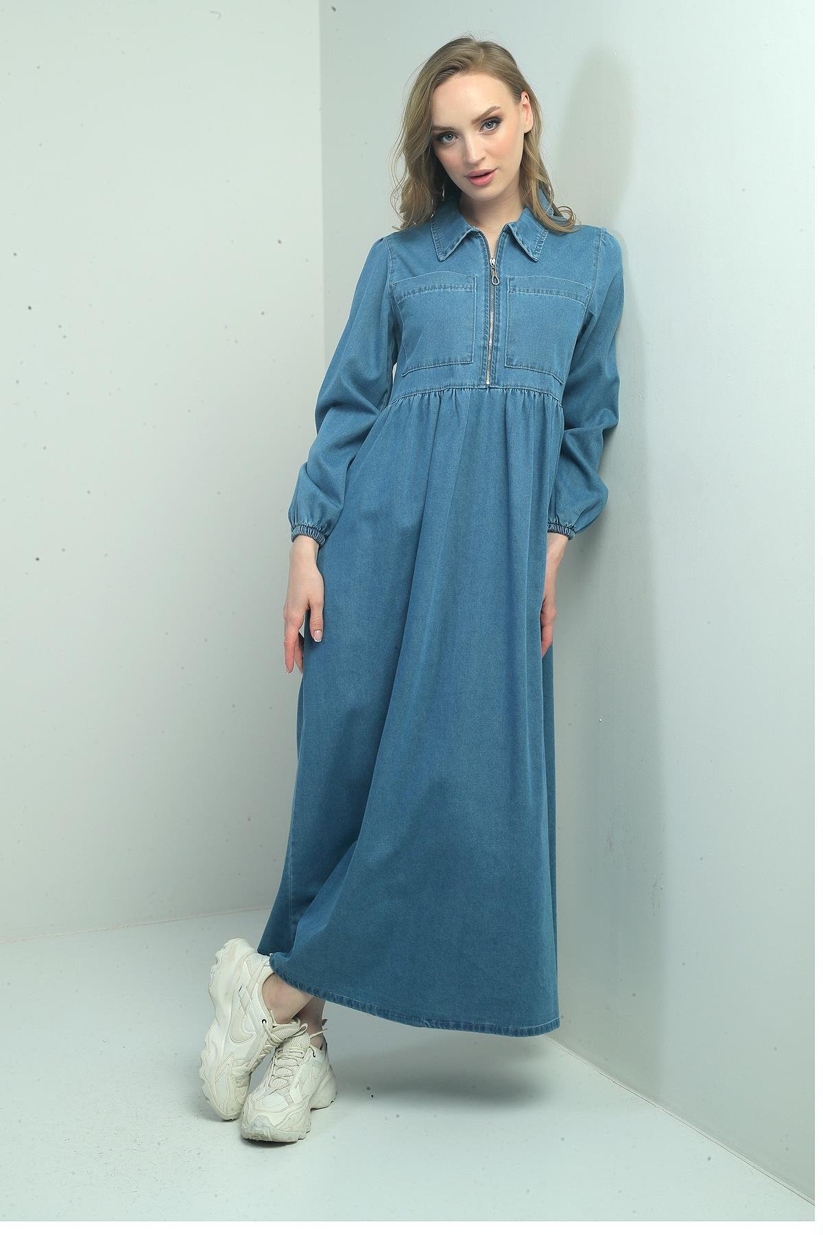 Kadın Önü Yarım Fermuarlı Önü Ve Yanı Cepli Uzun Kot Elbise (S-25Y4140004)