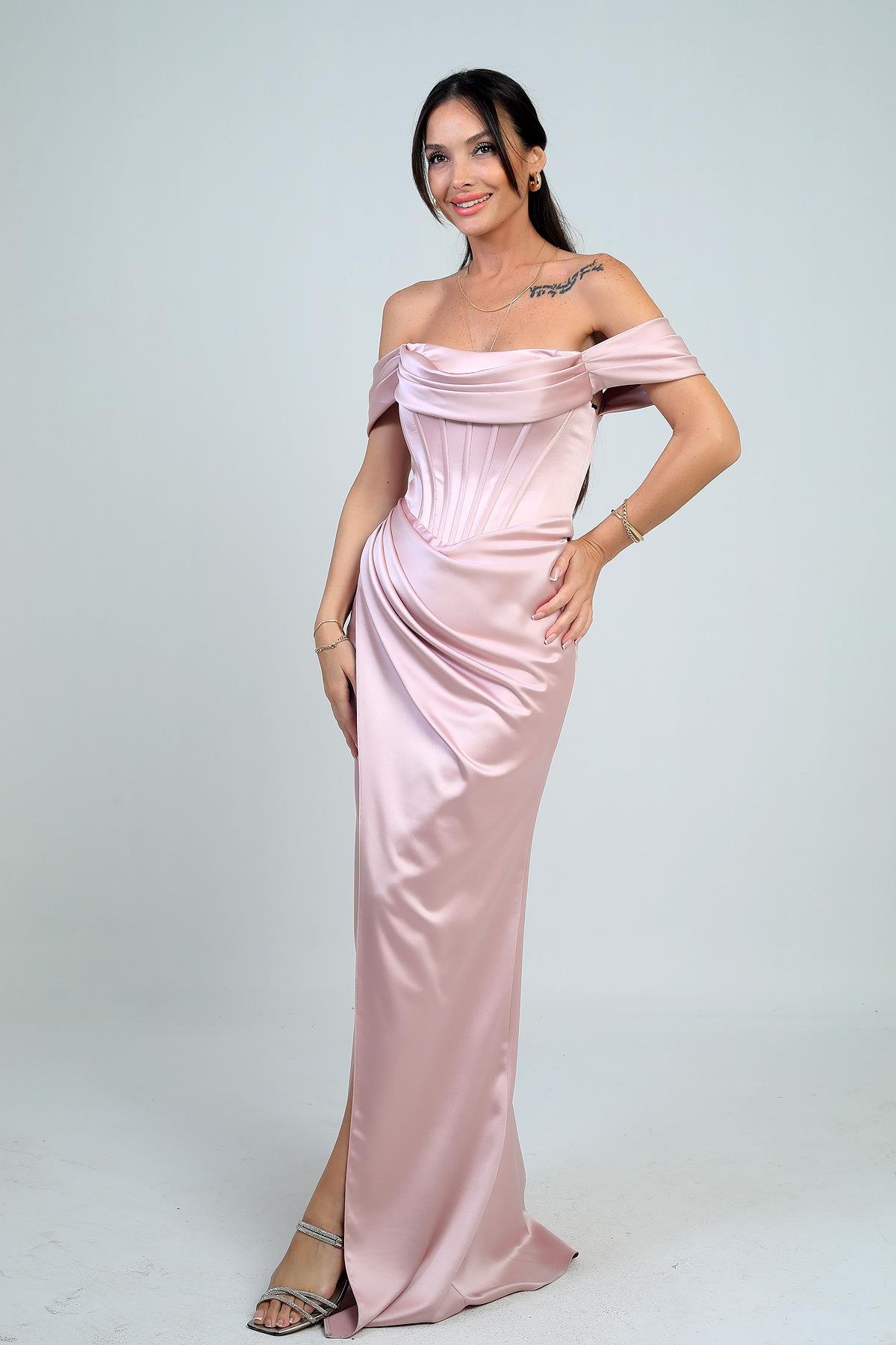 Kadın Straplez Düşük Kollu Astarlı Balenli Saten Uzun Elbise (S-25Y0230017)