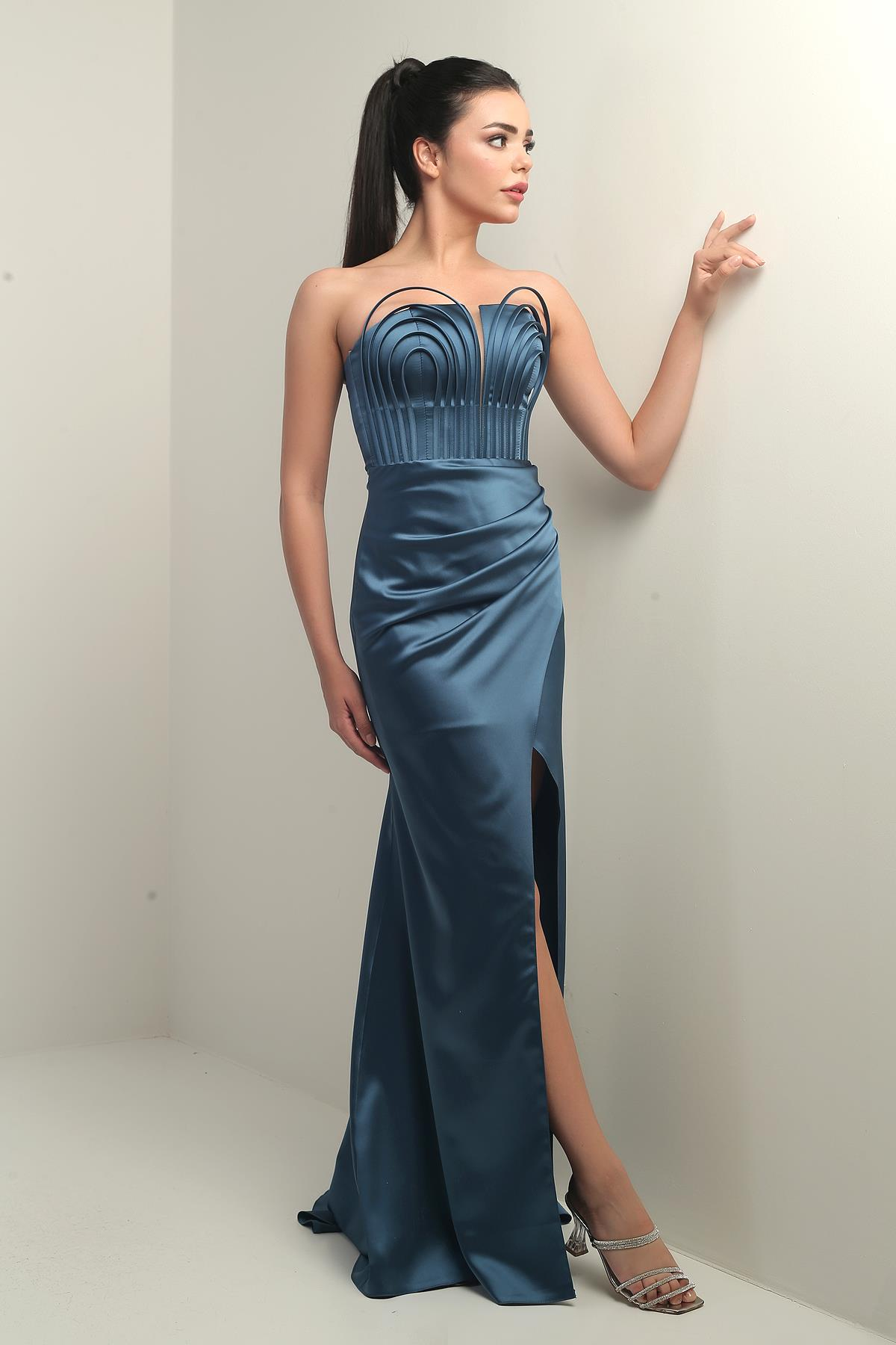 S-25Y0230015Kadın Straplez Önü Balen Biyeli Astarlı Saten Uzun Elbise