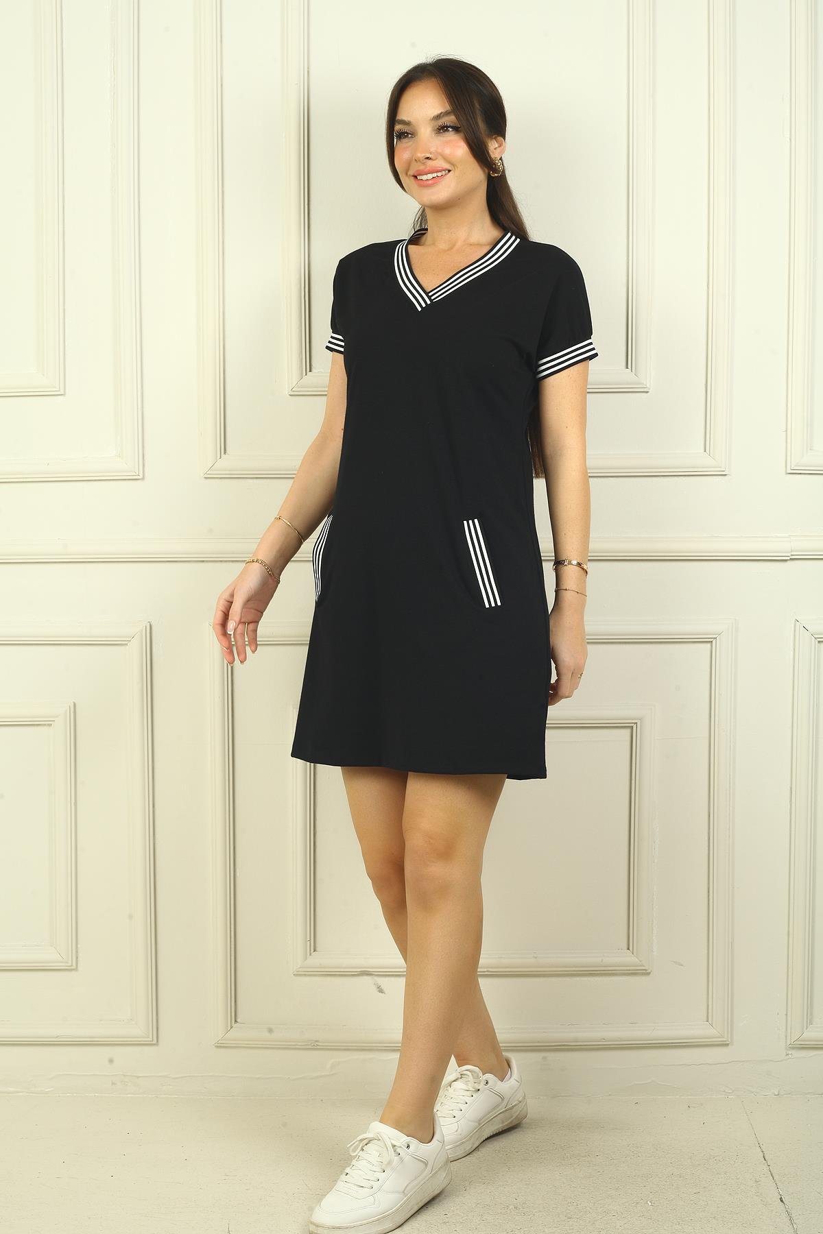 Kadın V Yaka Cepli Kısa Kollu Şerit Detaylı Elbise (S-24Y2220017)