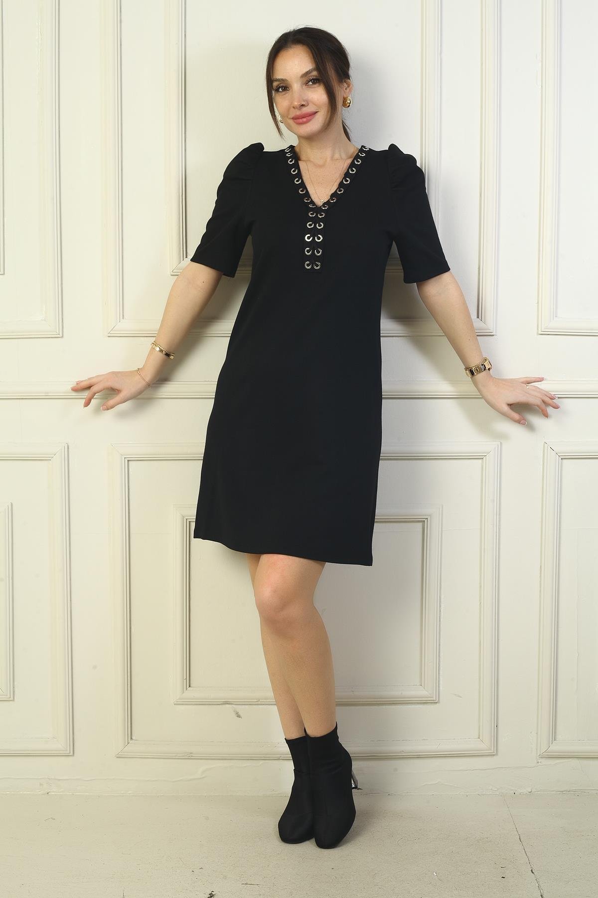 S-24Y0840126Kadın Yaka Detaylı Kısa Karpuz Kollu Kısa Elbise