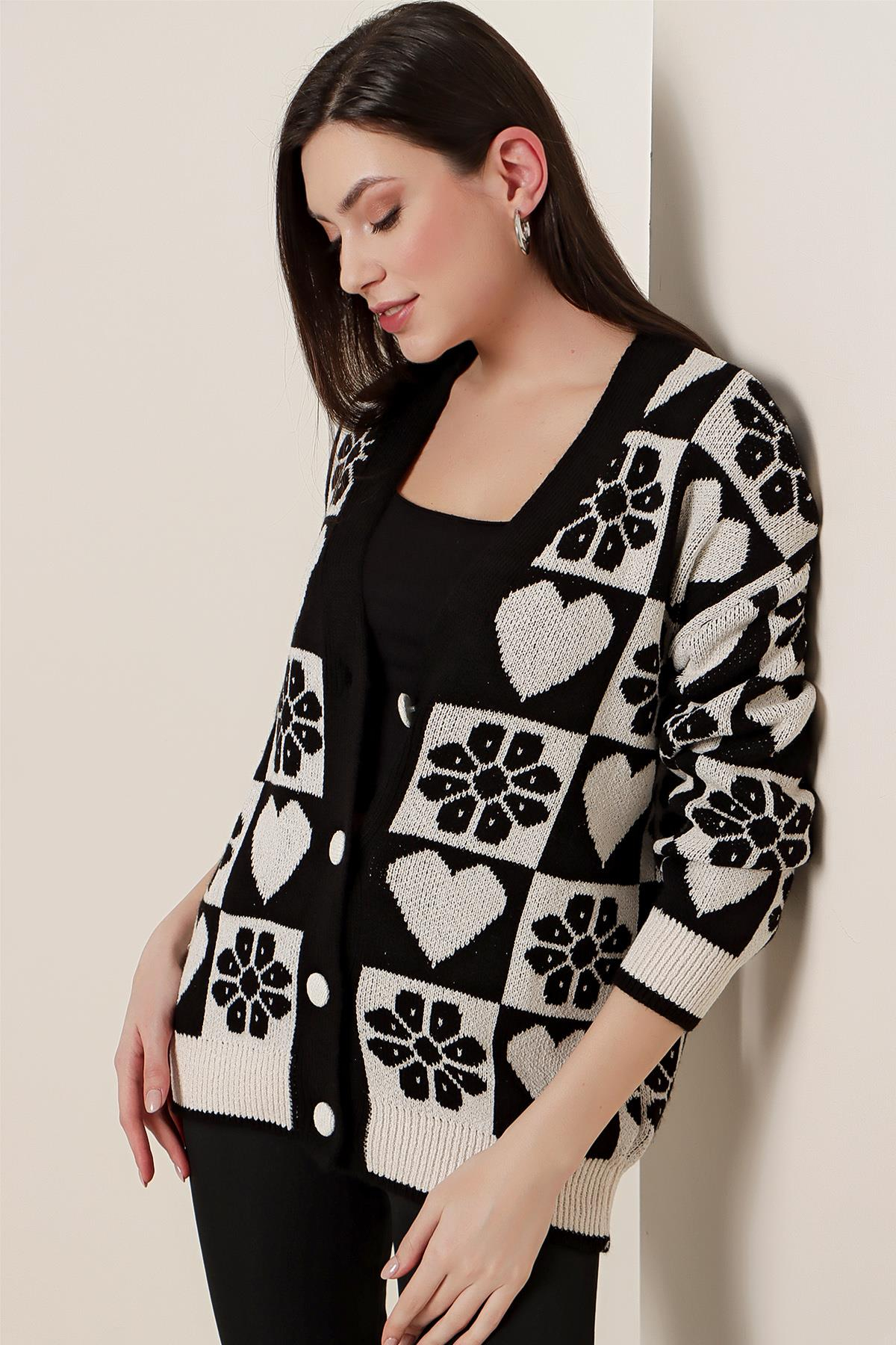 S-23K2800012Kalp Ve Çiçek Desenli Akrilik Hırka
