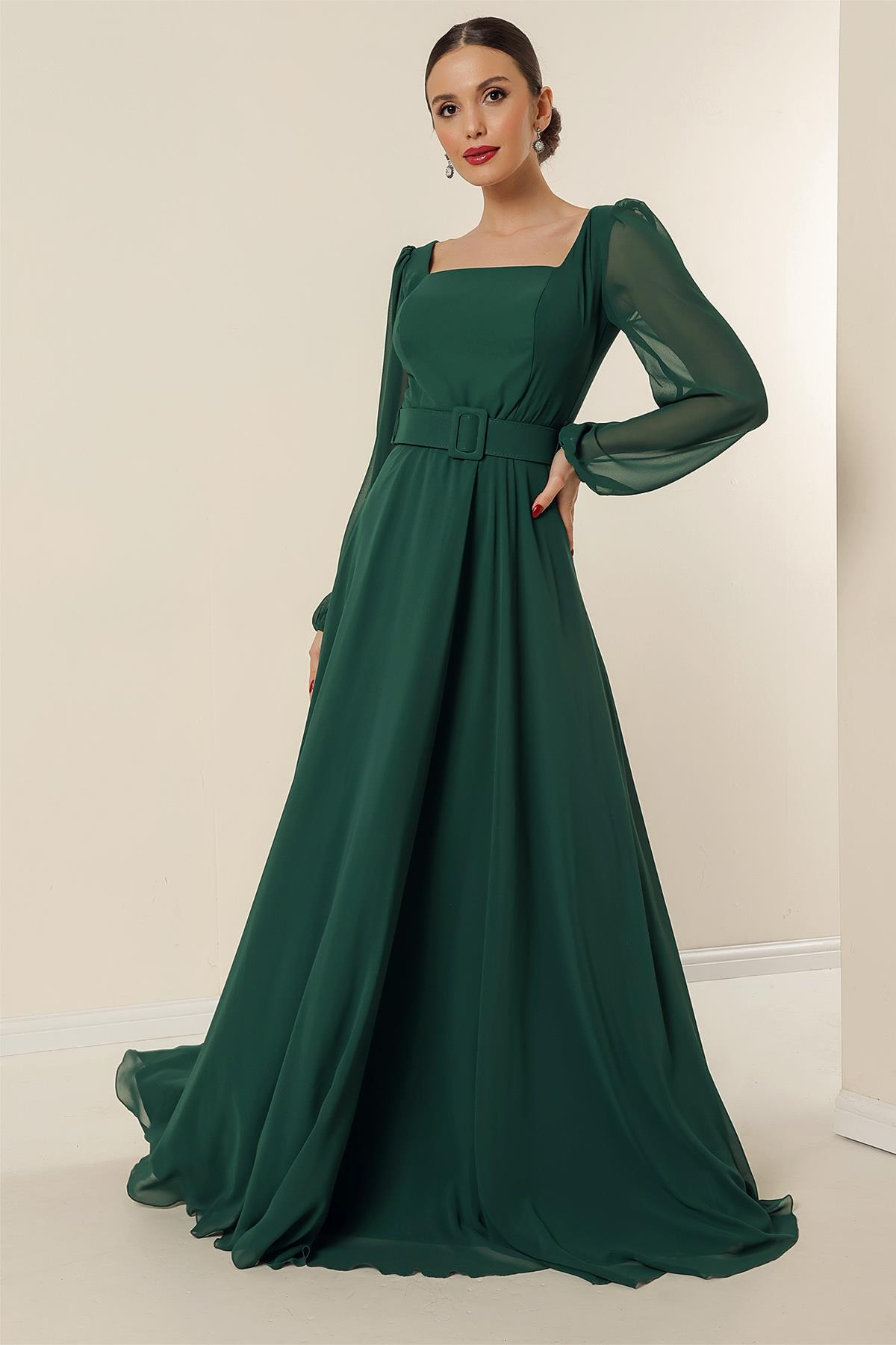 Kare Yaka Beli Kemerli Astarlı Şifon Uzun Abiye (S-23K3630001)