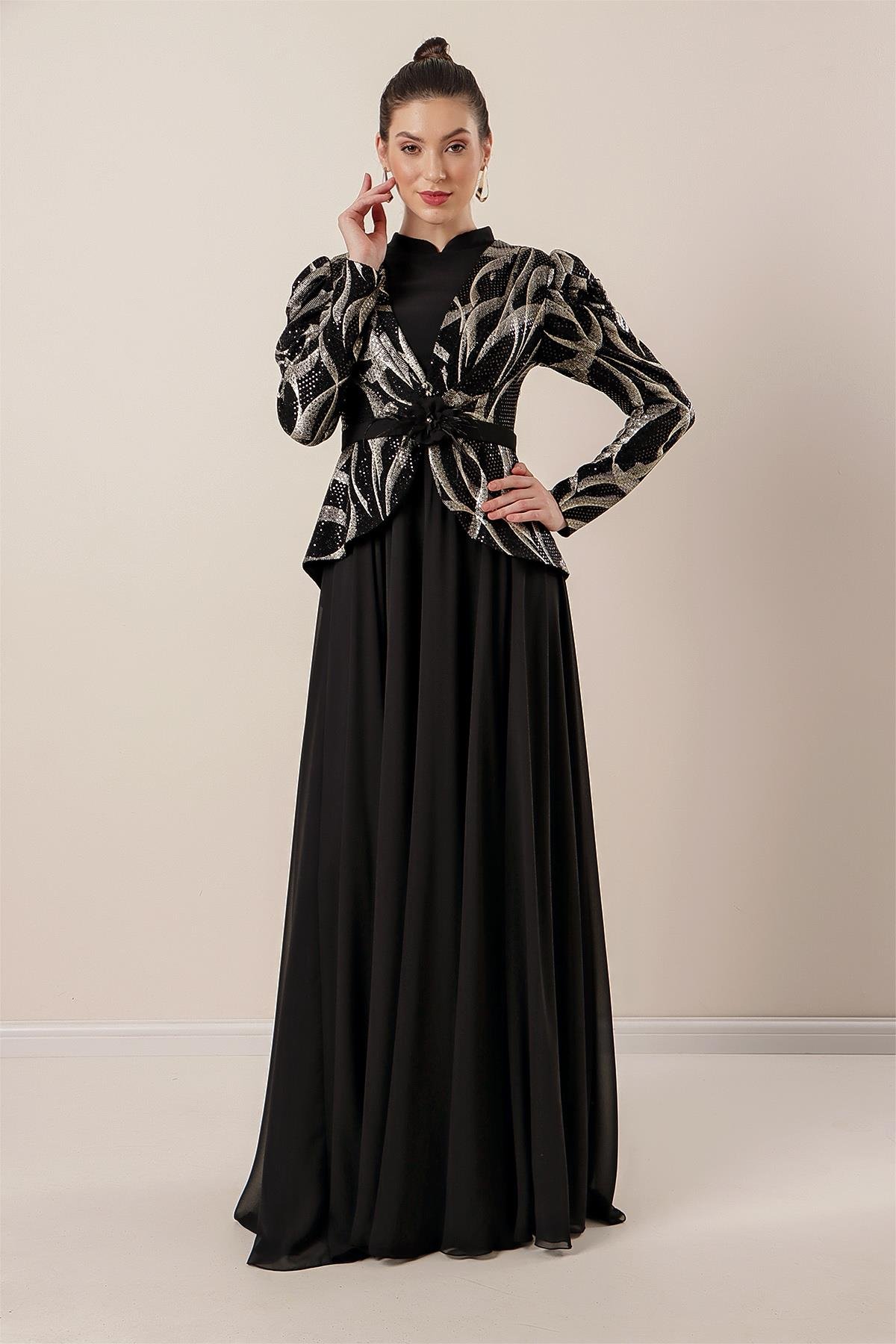 S-22K1190019Kolları Büzgülü Güllü KEmer Detaylı Astarlı Üstü Yaldızlı Şifon Elbise