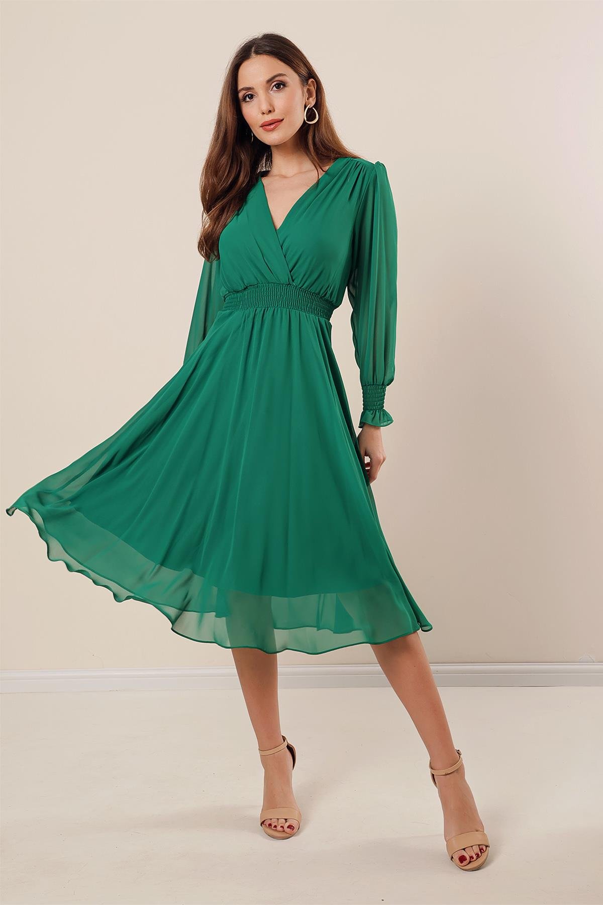 Kruvaze Yaka Astarlı Bel Ve Kol Uçları Gipeli Astarlı Şifon Elbise (S-23K1520027)