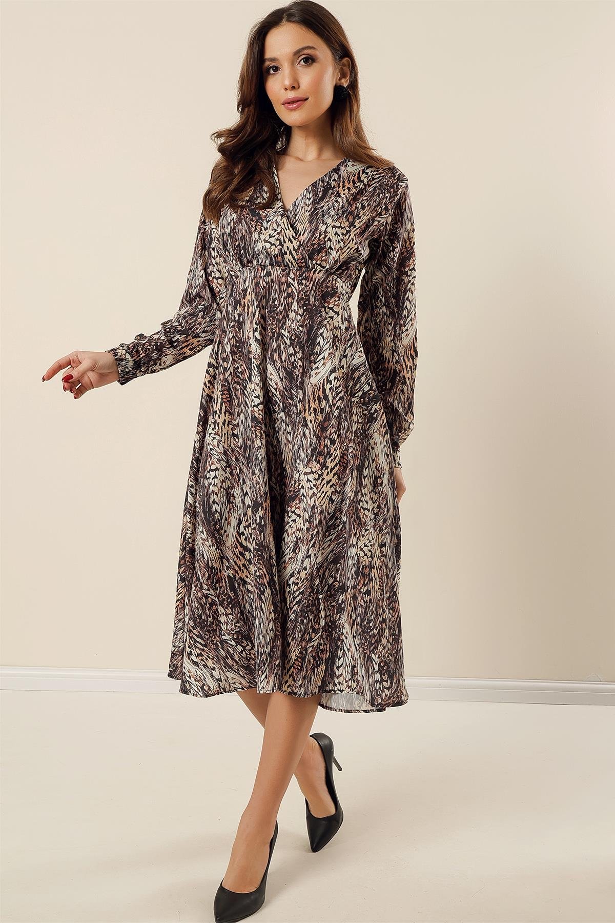 S-23K0080026Kruvaze Yaka Kolu Düğmeli Eteği Kloş Karışık Desenli Saten Elbise