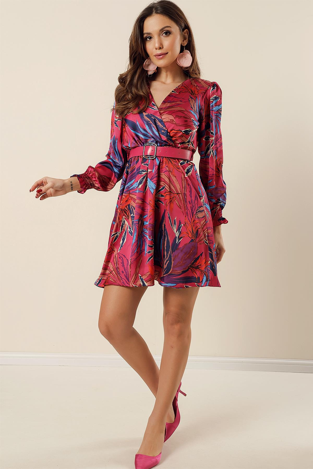 Kruvaze Yaka Yaprak Desenli Beli Kemerli Astarlı Saten Elbise (S-23K1520033)
