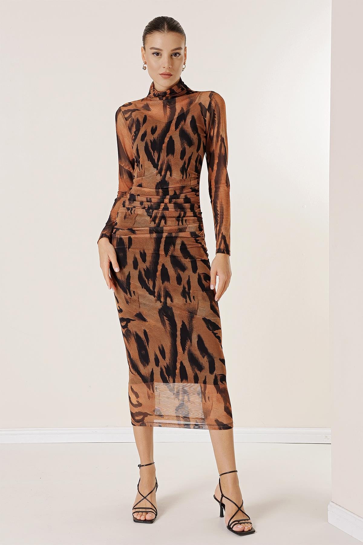 Leopar Desenli Önü Büzgülü Astarlı Tül Elbise (S-23K0840033)