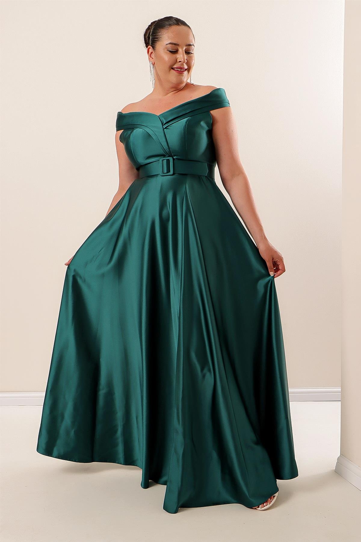 S-22K1040039Madonna YAka Beli Kemerli Astarlı Yırtmaçlı Büyük Beden Uzun Saten Elbise