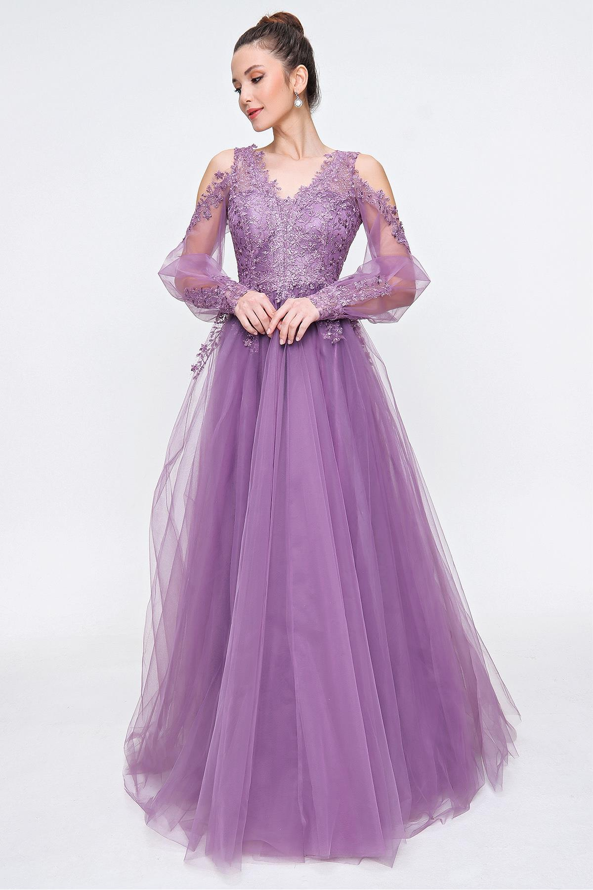 Omuz Açık Kolu Tül Dantelli Abiye (S-21K0500002)