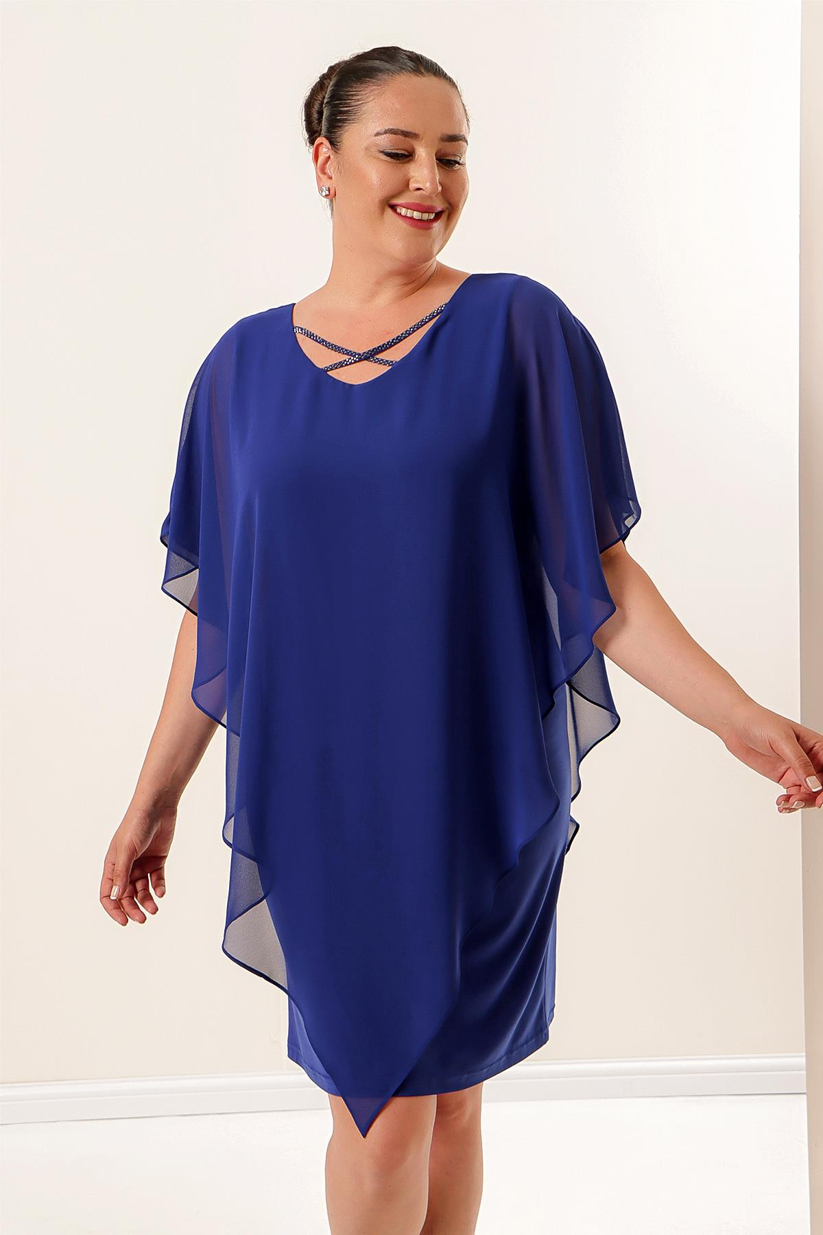 Ön Arka Taşlı Çapraz Bantlı Üstü Şifon Likralı Sandy Büyük Beden Elbise (S-22K2580002)