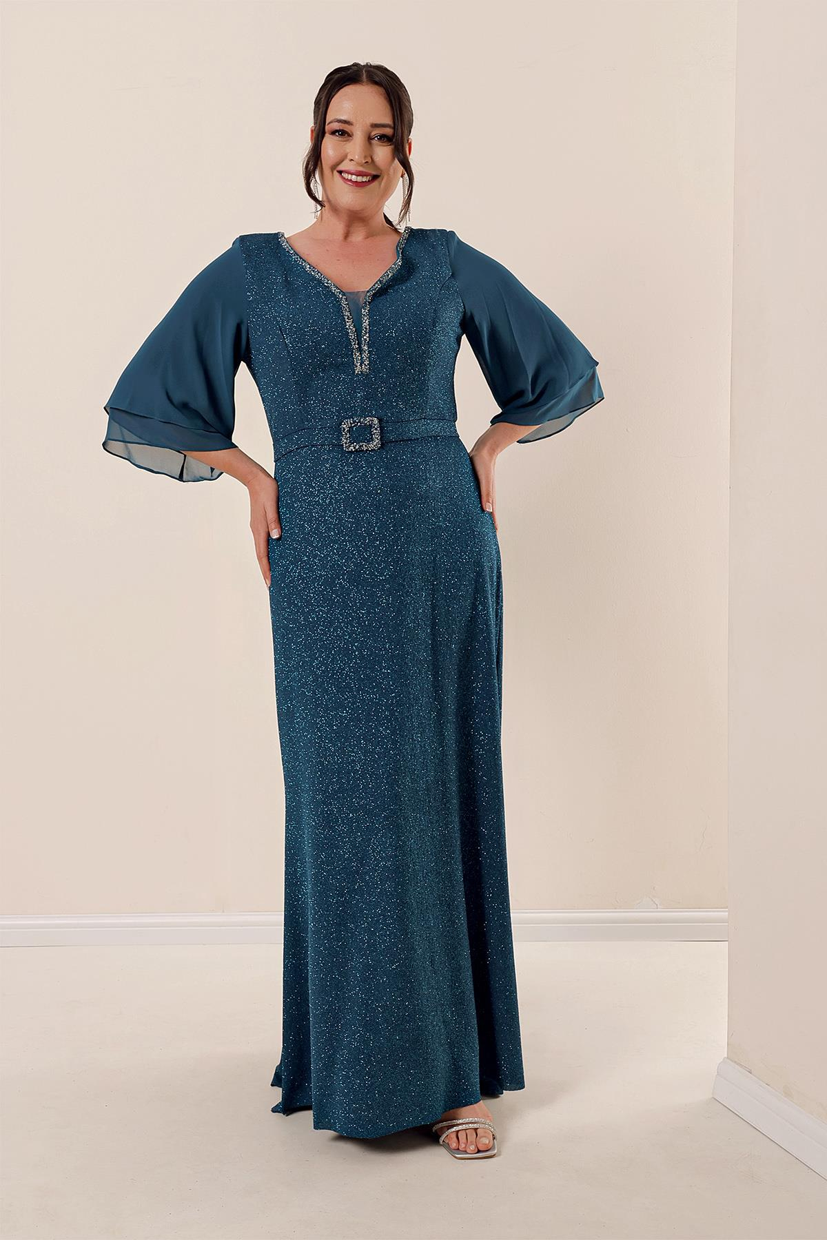 Ön Arka V Yaka Şifon Kollu Astarlı Tokalı Büyük Beden Simli Uzun Elbise (S-23K3050006)