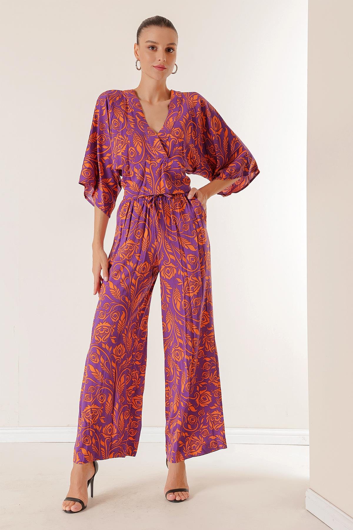 Ön arka V Yaka Yarasa Kol Bluz Beli Lastikli Cepli Palazzo Pantolon Yaprak Desenli 2'li Takım (S-23K1520071)