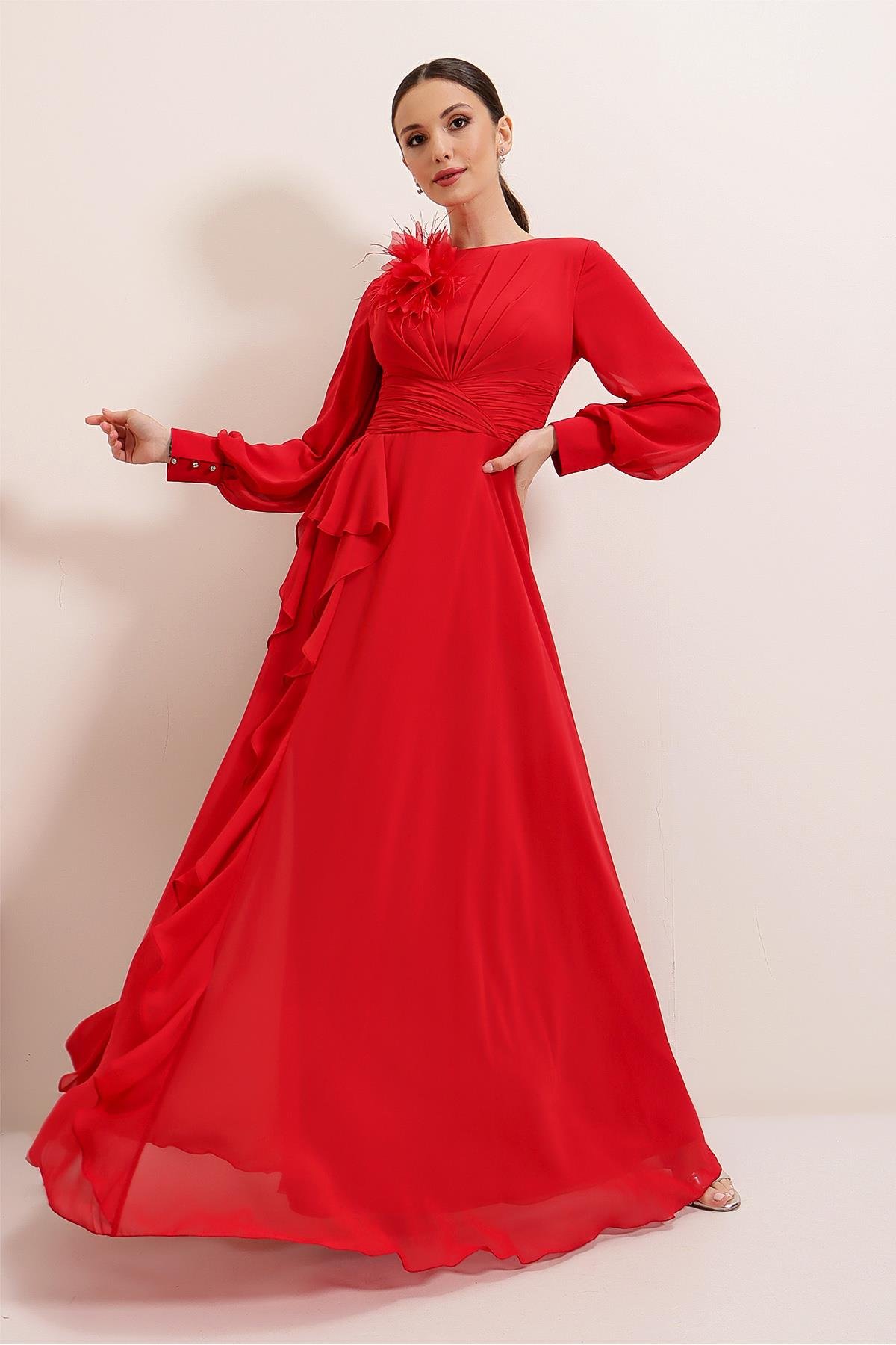 S-22K1190005Önü Çiçek Detaylı Pileli Yanı Volanlı Astarlı Uzun Şifon Elbise