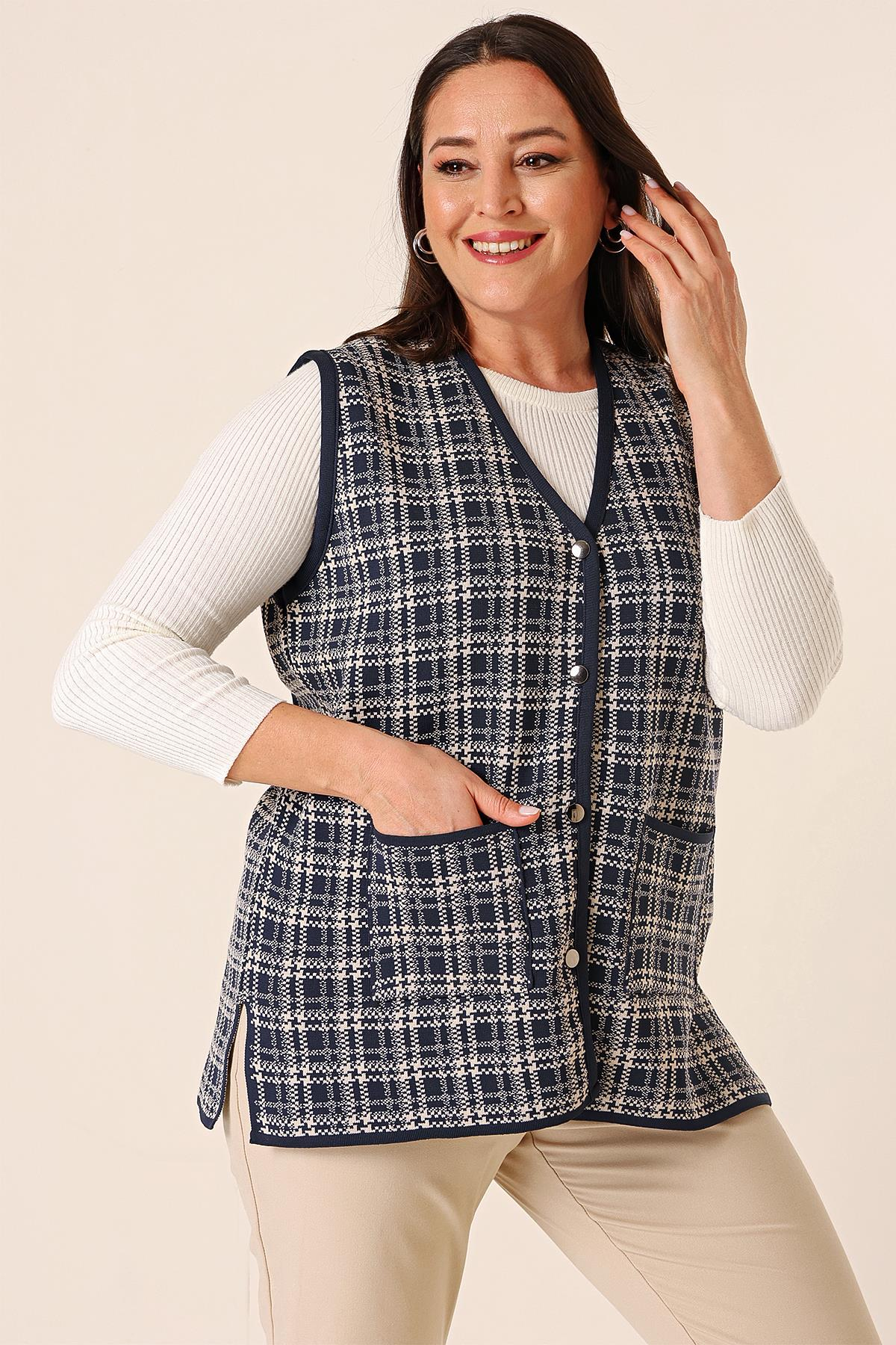 Önü Metal Düğmeli Ekose Desenli Cepli Büyük Beden Triko Yelek (S-23K1800037)