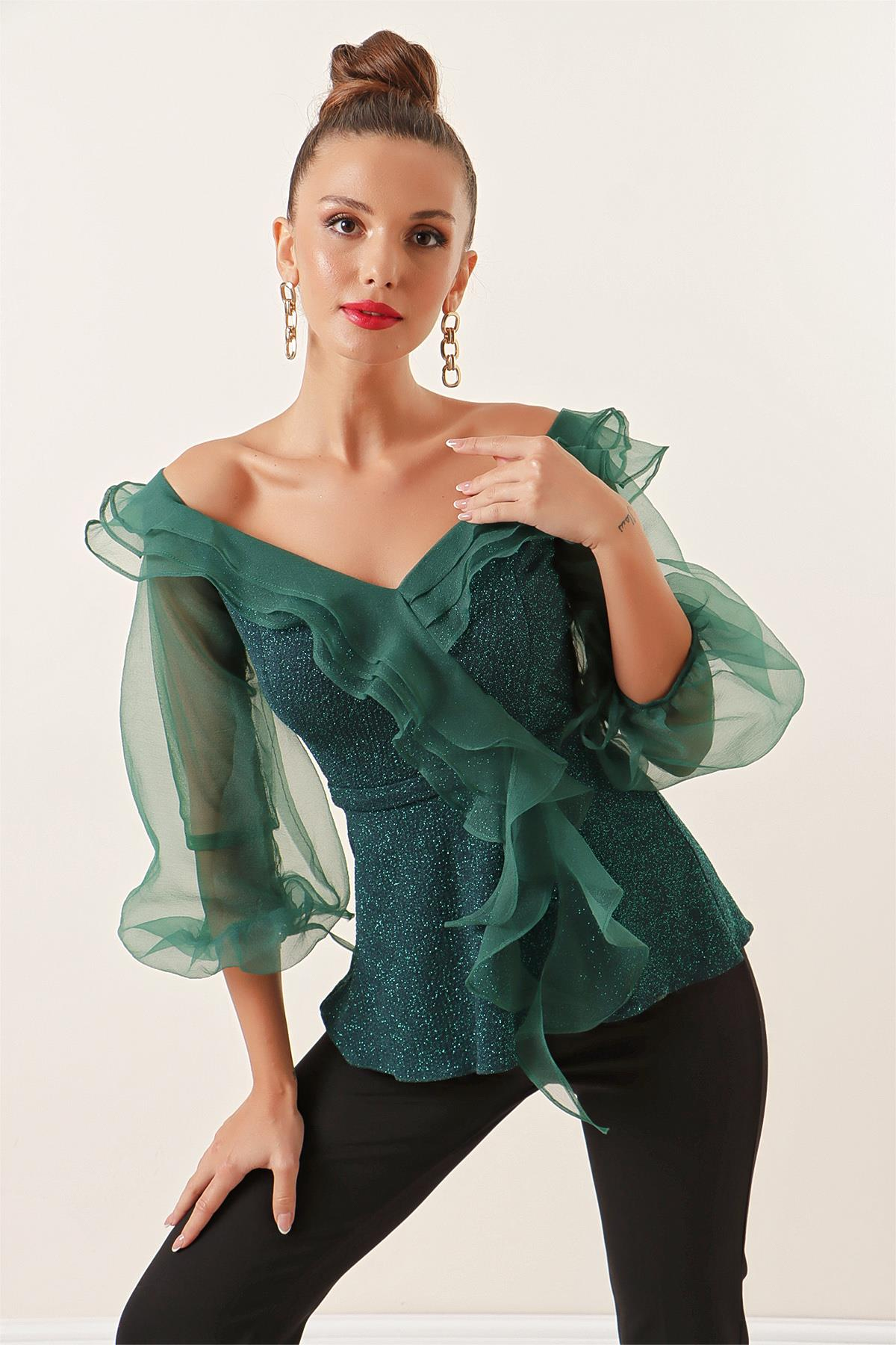 S-23K0190003Önü Volanlı Organze Simli Bluz