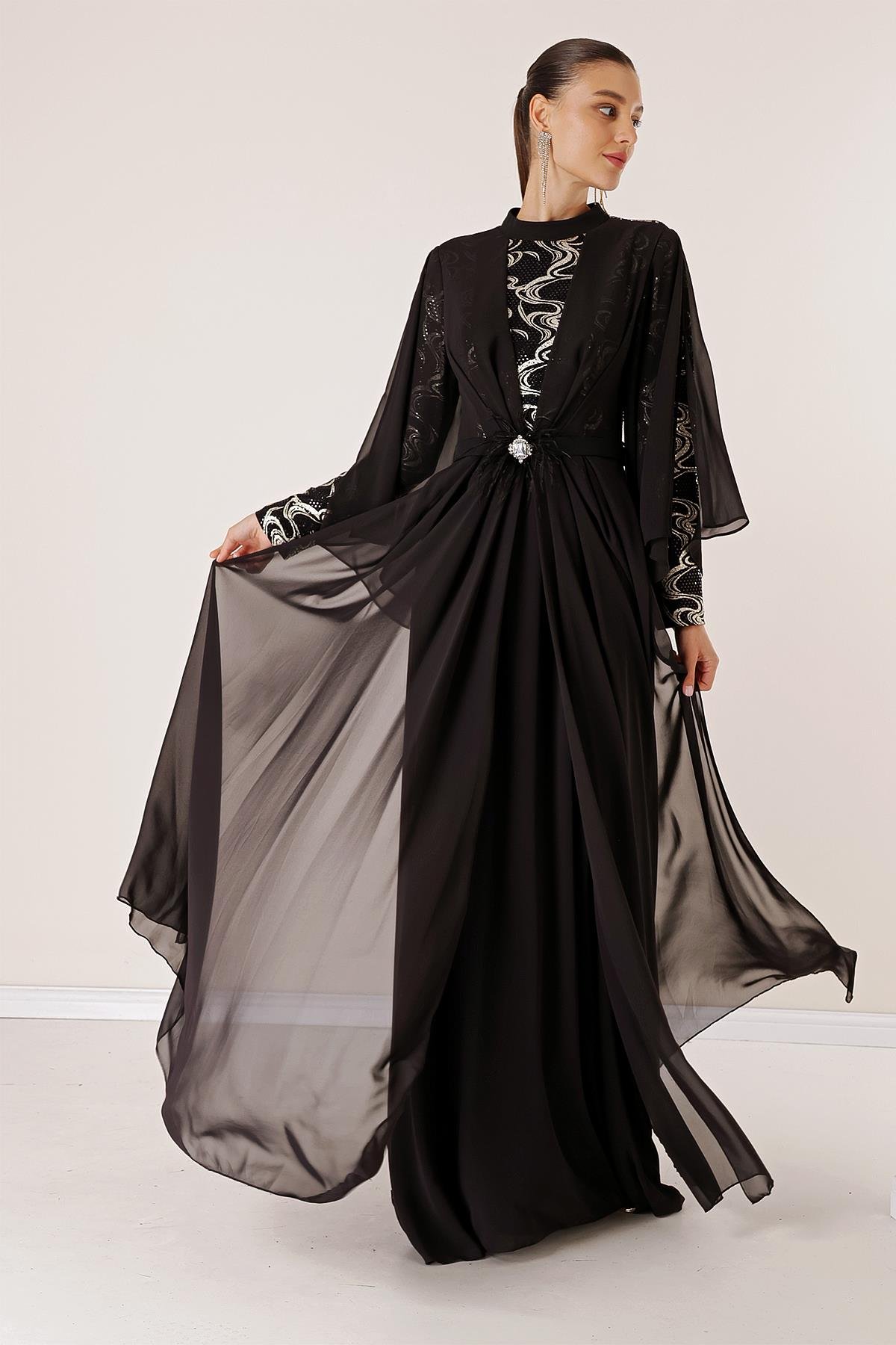 S-23K1190016Pullu Yaldızlı Beli Taş Ve Tüy Detay Kemerli Astarlı Karışık Desenli Büyük Beden Şifon Uzun Tesettür Elbise